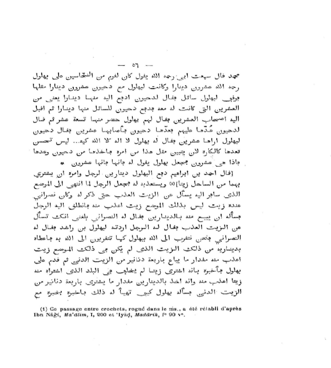مُحَمَّدٍ، قَالَ: سَمِعْتُ أَبِي، رَحِمَهُ اللَّهُ، يَقُولُ: كَانَ لِقَوْمٍ مِنَ النَّخَّاسِينَ عَلَى بُهْلُولٍ، رَحِمَهُ اللَّهُ، عِشْرُونَ دِينَارًا، وَكَانَتْ لِبُهْلُولٍ مَعَ دَحْيُونٍ عِشْرُونَ دِينَارًا مِثْلُهَا، فَوَقَفَ بِبُهْلُولٍ سَائِلٌ، فَقَالَ لِدَحْيُونٍ: ادْفَعْ إِلَيْهِ مِنْهَا دِينَارًا، ثُمَّ أَقْبَلَ عَلَيْهِ أَصْحَابُ الْعِشْرِينَ، فَقَالَ لَهُمْ بُهْلُولٌ: حَضَرَ مِنْهَا تِسْعَةَ عَشَرَ، ثُمَّ قَالَ لِدَحْيُونٍ: عُدَّهَا عَلَيْهِمْ، فَعَدَّهَا دَحْيُونٌ، فَأَصَابَهَا عِشْرِينَ، فَقَالَ دَحْيُونٌ لِبُهْلُولٍ: «أَرَاهَا عِشْرِينَ» فَقَالَ لَهُ بُهْلُولٌ: " لا إِلَهَ إِلا اللَّهُ أَرَاكَ لا تُحْسِنُ الْعَدَّ، كَالْكَارِهِ لأَنْ يَتَبَيَّنَ مِثْلَ هَذَا مِنْ أَمْرِهِ، فَأَخَذَهَا مِنْ دَحْيُونٍ، وَعَدَّهَا فَإِذَا هِيَ عِشْرُونَ، فَجَعَلَ بُهْلُولٌ، يَقُولُ لَهُ: «فَإِنَّهَا فَإِنَّهَا عِشْرُونَ» .