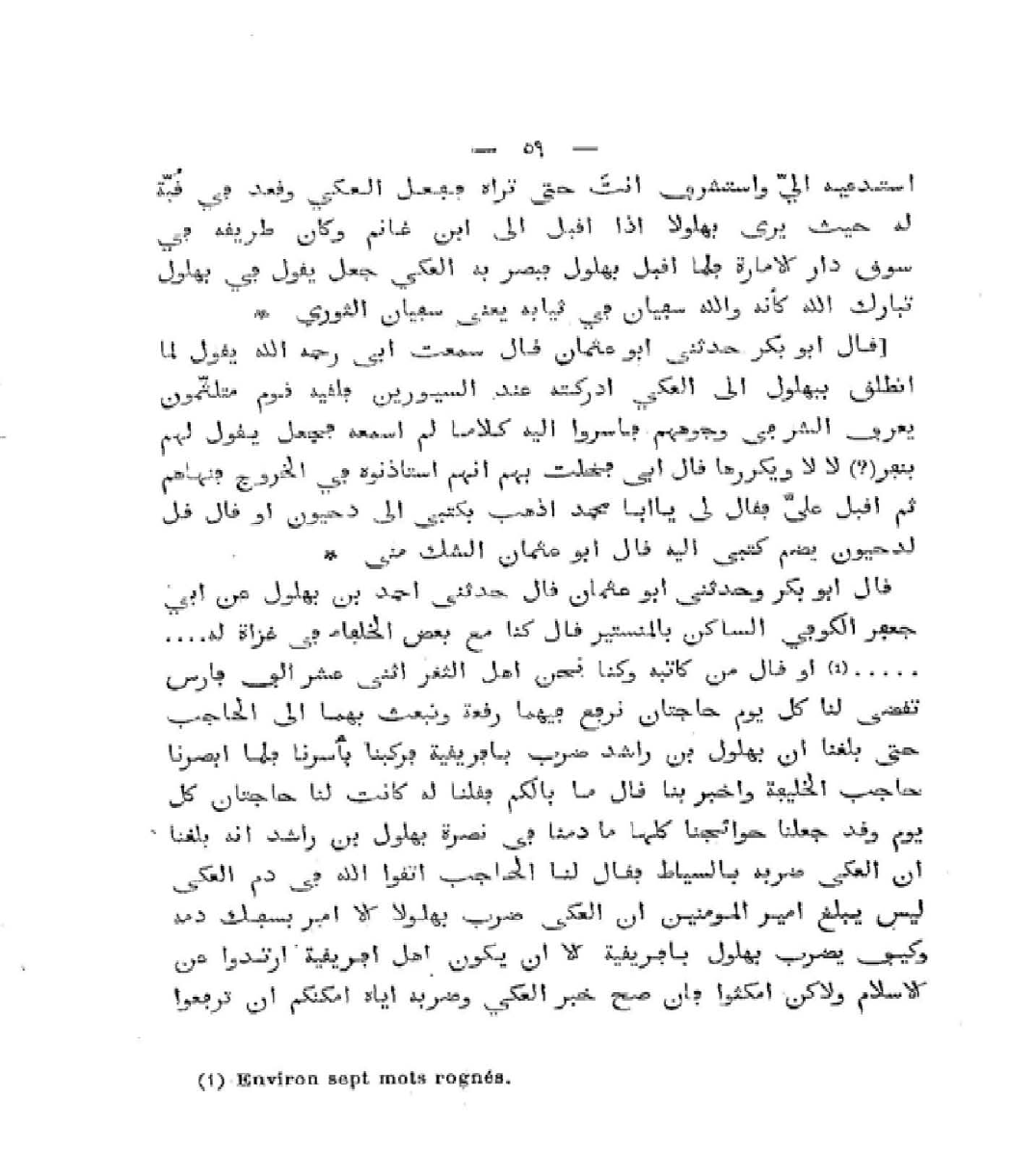 قَالَ أَبُو بَكْرٍ مُحَمَّدُ بْنُ اللَّبَّادِ: وَحَدَّثَنِي أَبُو عُثْمَانَ سَعِيدُ بْنُ مُحَمَّدٍ، قَالَ: حَدَّثَنِي أَحْمَدُ بْنُ بُهْلُولٍ، عَنْ أَبِي جَعْفَرٍ أَحْمَدَ الْكُوفِيِّ السَّاكِنِ بِالْمُنَسْتِيرِ، قَالَ: كُنَّا فِي غَزَاةٍ مَعَ بَعْضِ الْخُلَفَاءِ، وَكُنَّا مَعَهُ مِنْ أَهْلِ الثُّغُورِ اثْنَيْ عَشَرَ أَلْفِ فَارِسٍ، تُقْضَى لَنَا كُلَّ يَوْمٍ حَاجَتَانِ نَرْفَعُ فِيهِمَا رُقْعَةً، وَنَبْعَثُ بِهَا إِلَى الْحَاجِبِ، حَتَّى بَلَغَنَا أَنَّ بُهْلُولَ بْنَ رَاشِدٍ ضُرِبَ بِإِفْرِيقِيَّةَ، فَأَتَيْنَا بِأَسْرِنَا إِلَى بَابِ الْخَلِيفَةِ، فَلَمَّا أَبْصَرْنَا حَاجِبَ الْخَلِيفَةِ، وَأَخْبَرَنَا، قَالَ: مَا بَالُكُمْ؟ فَقُلْنَا لَهُ: كَانَتْ لَنَا حَاجَتَانِ كُلَّ يَوْمٍ، وَقَدْ جَعَلْنَا حَوَائِجَنَا كُلَّهَا مَا دُمْنَا فِي نُصْرَةِ بُهْلُولِ بْنِ رَاشِدٍ، إِنَّهُ بَلَغَنَا أَنَّ الْعَكِّيَّ ضَرَبَهُ بِالسِّيَاطِ، فَقَالَ لَنَا الْحَاجِبُ: اتَّقُوا اللَّهَ فِي دَمِ الْعَكِّيِّ، لَيْسَ يَبْلُغُ أَمِيرَ الْمُؤْمِنِينَ أَنَّ الْعَكِّيَّ ضَرَبَ بُهْلُولا إِلا أَمَرَ بِسَفْكِ دَمِهِ، وَكَيْفَ يُضْرَبُ بُهْلُولٌ بِإِفْرِيقِيَّةَ إِلا أَنْ يَكُونَ أَهْلُ إِفْرِيقِيَّةَ ارْتَدُّوا عَنِ الإِسْلامِ؟ وَلَكِنِ امْكُثُوا فَإِنْ صَحَّ خَبَرُ الْعَكِّيِّ وَضَرْبُهُ إِيَّاهُ أَمْكَنَكُمْ أَنْ تَرْفَعُوا