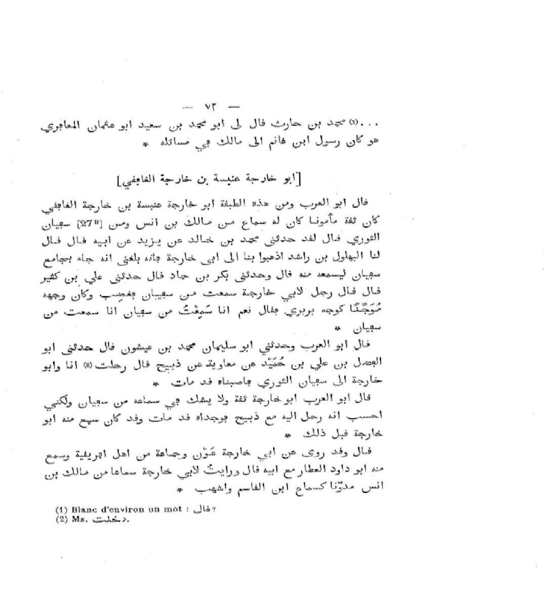 قَالَ أَبُو الْعَرَبِ: وَحَدَّثَنِي بَكْرُ بْنُ حَمَّادٍ، قَالَ: حَدَّثَنِي عَلِيُّ بْنُ كَثِيرٍ، قَالَ: قَالَ رَجُلٌ لأَبِي خَارِجَةَ: سَمِعْتَ مِنْ سُفْيَانَ؟ فَغَضِبَ وَكَانَ وَجْهُهُ مُوجَنًا كَوَجْهِ بَرْبَرِيٍّ، فَقَالَ: نَعَمْ، أَنَا سَمِعْتُ مِنْ سُفْيَانَ، أَنَا سَمِعْتُ مِنْ سُفْيَانَ.