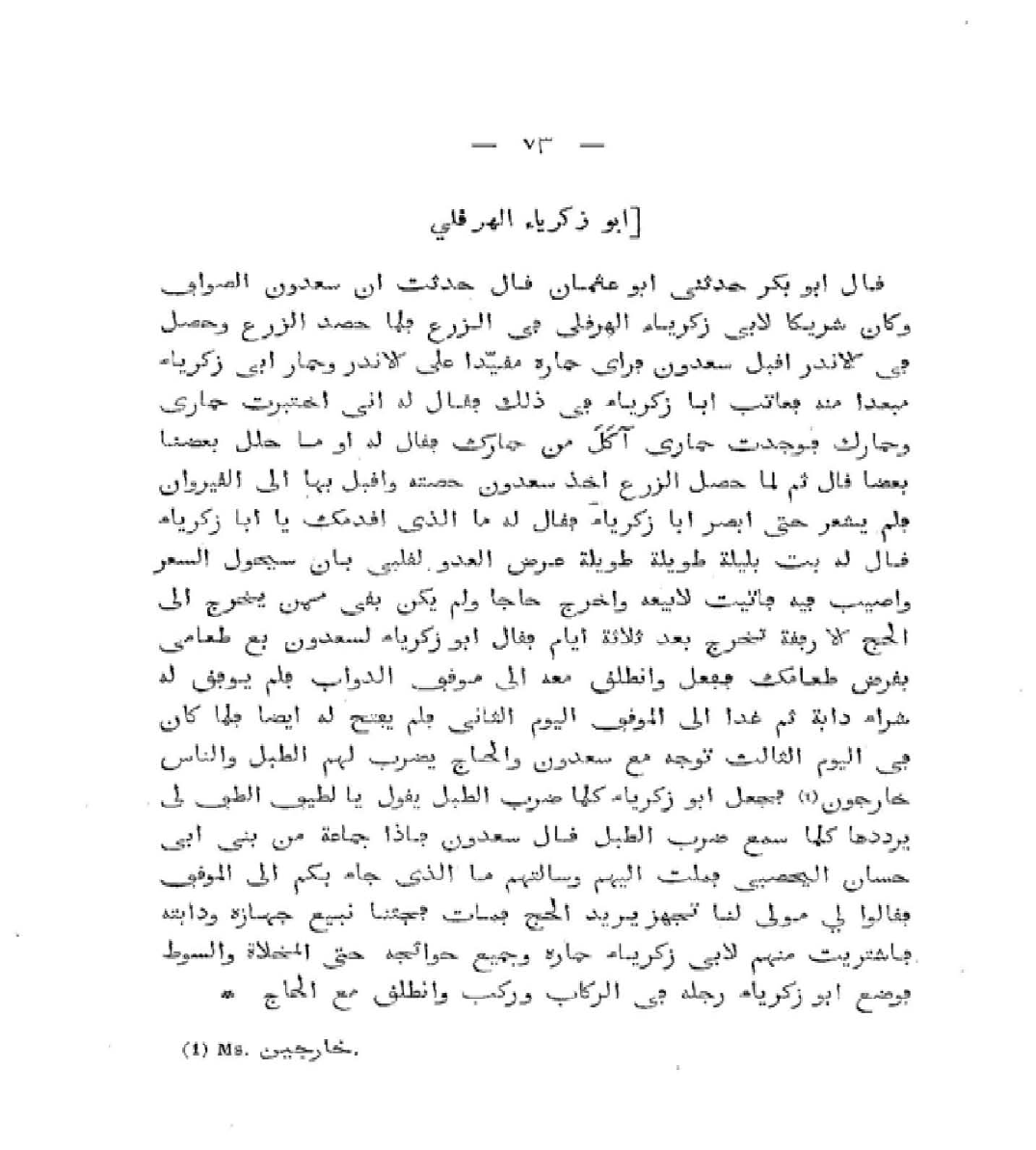 قَالَ أَبُو بَكْرٍ مُحَمَّدُ بْنُ مُحَمَّدٍ: حَدَّثَنِي أَبُو عُثْمَانَ سَعِيدُ بْنُ مُحَمَّدٍ، قَالَ: حُدِّثْتُ أَنَّ سَعْدُونًا الصَّوَّافَ كَانَ شَرِيكًا لأَبِي زَكَرِيَّاءَ الْهِرَقْلِيِّ فِي الزَّرْعِ، فَلَمَّا حُصِدَ الزَّرْعُ وَحُصِّلَ فِي الأَنْدَرِ، أَقْبَلَ سَعْدُونٌ، فَرَأَى حِمَارَهُ مُقَيَّدًا عَلَى الأَنْدَرِ، وَحِمَارَ أَبِي زَكَرِيَّاءَ مُبْعَدًا مِنْهُ، فَعَاتَبَ أَبَا زَكَرِيَّاءَ فِي ذَلِكَ، فَقَالَ لَهُ: إِنِّي اخْتَبَرْتُ حِمَارِي وَحِمَارَكَ فَوَجَدْتُ حِمَارِي آكَلَ مِنْ حِمَارِكَ، فَقَالَ لَهُ: أَوَ مَا حَلَّلَ بَعْضُنَا بَعْضًا؟ قَالَ: ثُمَّ قَسَّمَا مَا حَصَدَاهُ بَيْنَهُمَا، وَأَخَذَ سَعْدُونٌ حِصَّتَهُ وَأَقْبَلَ بِهَا إِلَى الْقَيْرَوَانِ، فَلَمْ يَشْعُرْ حَتَّى أَبْصَرَ أَبَا زَكَرِيَّاءَ، فَقَالَ لَهُ: مَا الَّذِي أَقْدَمَكَ يَا أَبَا زَكَرِيَّاءَ؟ قَالَ لَهُ: بِتُّ بِلَيْلَةٍ طَوِيلَةٍ عَرَضَ الْعَدُوُّ لِقَلْبِي، بِأَنْ سَيَحُولَ السِّعْرُ وَأُصِيبُ فِيهِ، فَأَتَيْتُ لأَبِيعَهُ، وَأَخْرُجَ حَاجًّا، وَلَمْ يَكُنْ بَقِيَ مِمَّنْ يَخْرُجُ إِلَى الْحَجِّ إِلا رِفْقَةً تَخْرُجُ بَعْدَ ثَلاثَةِ أَيَّامٍ، فَقَالَ أَبُو زَكَرِيَّاءَ لِسَعْدُونٍ: بِعْ طَعَامِي بِقَرْضِ طَعَامِكَ، فَفَعَلَ، وَانْطَلَقَ مَعَهُ إِلَى مَوْقِفِ الدَّوَابِّ، فَلَمْ يُوَفَّقْ لَهُ شِرَاءُ دَابَّةٍ، ثُمَّ غَدَا إِلَى الْمَوْقِفِ الْيَوْمَ الثَّانِي، فَلَمْ يُفْتَحْ لَهُ أَيْضًا، فَلَمَّا كَانَ فِي الْيَوْمِ الثَّالِثِ تَوَجَّهَ مَعَ سَعْدُونٍ وَالْحَاجُّ يُضْرَبُ لَهُمُ الطَّبْلُ وَالنَّاسُ خَارِجُونَ، فَجَعَلَ أَبُو زَكَرِيَّاءَ كُلَّمَا ضُرِبَ الطَّبْلُ يَقُولُ: يَا لَطِيفُ أَلْطِفْ بِي، يُرَدِّدُهَا كُلَّ مَا سَمِعَ ضَرْبَ الطَّبْلِ، قَالَ سَعْدُونٌ: فَإِذَا جَمَاعَةٌ مِنْ بَنِي أَبِي حَسَّانٍ الْيَحْصِبِيِّ، فَمِلْتُ إِلَيْهِمْ وَسَأَلْتُهُمْ: مَا الَّذِي جَاءَ بِكُمْ إِلَى الْمَوْقِفِ؟ فَقَالُوا لِي: مَوْلًى لَنَا تَجَهَّزَ يُرِيدُ الْحَجَّ فَمَاتَ، فَجِئْنَا نَبِيعُ جِهَازَهُ وَدَابَّتَهُ، فَاشْتَرَيْتُ مِنْهُمْ لأَبِي زَكَرِيَّاءَ حِمَارَهُ وَجَمِيعَ حَوَائِجِهِ حَتَّى الْمِخْلاةَ وَالسَّوْطَ، فَوَضَعَ أَبُو زَكَرِيَّاءَ رِجْلَهُ فِي الرِّكَابِ وَانْطَلَقَ مَعَ الْحَاجِّ.