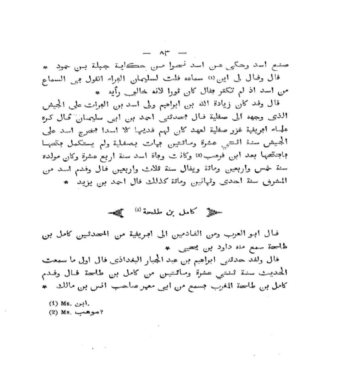قَالَ أَبُو الْعَرَبِ: وَمِنَ الْقَادِمِينَ إِلَى إِفْرِيقِيَّةَ مِنَ الْمُحَدِّثِينَ كَامِلُ بْنُ طَلْحَةَ، سَمِعَ مِنْهُ دَاوُدُ بْنُ يَحْيَى.