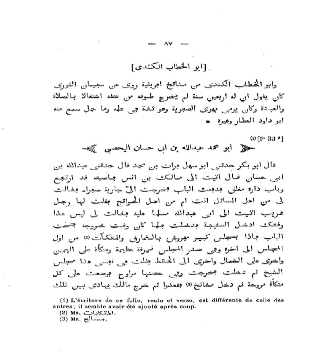 وَأَبُو الْخَطَّابِ الْكِنْدِيُّ مِنْ مَشَائِخِ إِفْرِيقِيَّةَ، وَرَوَى عَنُه سُفْيَانُ الثَّوْرِيُّ، كَانَ يَقُولُ: إِنَّ لَهُ أَرْبَعِينَ سَنَةً لَمْ يَخْرُجْ طَوْقُهُ مِنْ عنُقِهِ اشْتِغَالا بِالصَّلاةِ وَالْعِبَادَةِ، وَكَانَ يَرْمِي بِهَوَى الصُّفْرِيَّةِ، وَهُوَ ثِقَةٌ فِي عِلْمِهِ وَمَا حَمَلَ، سَمِعَ مِنْهُ أَبُو دَاوُدَ الْعَطَّارُ وَغَيْرُهُ.