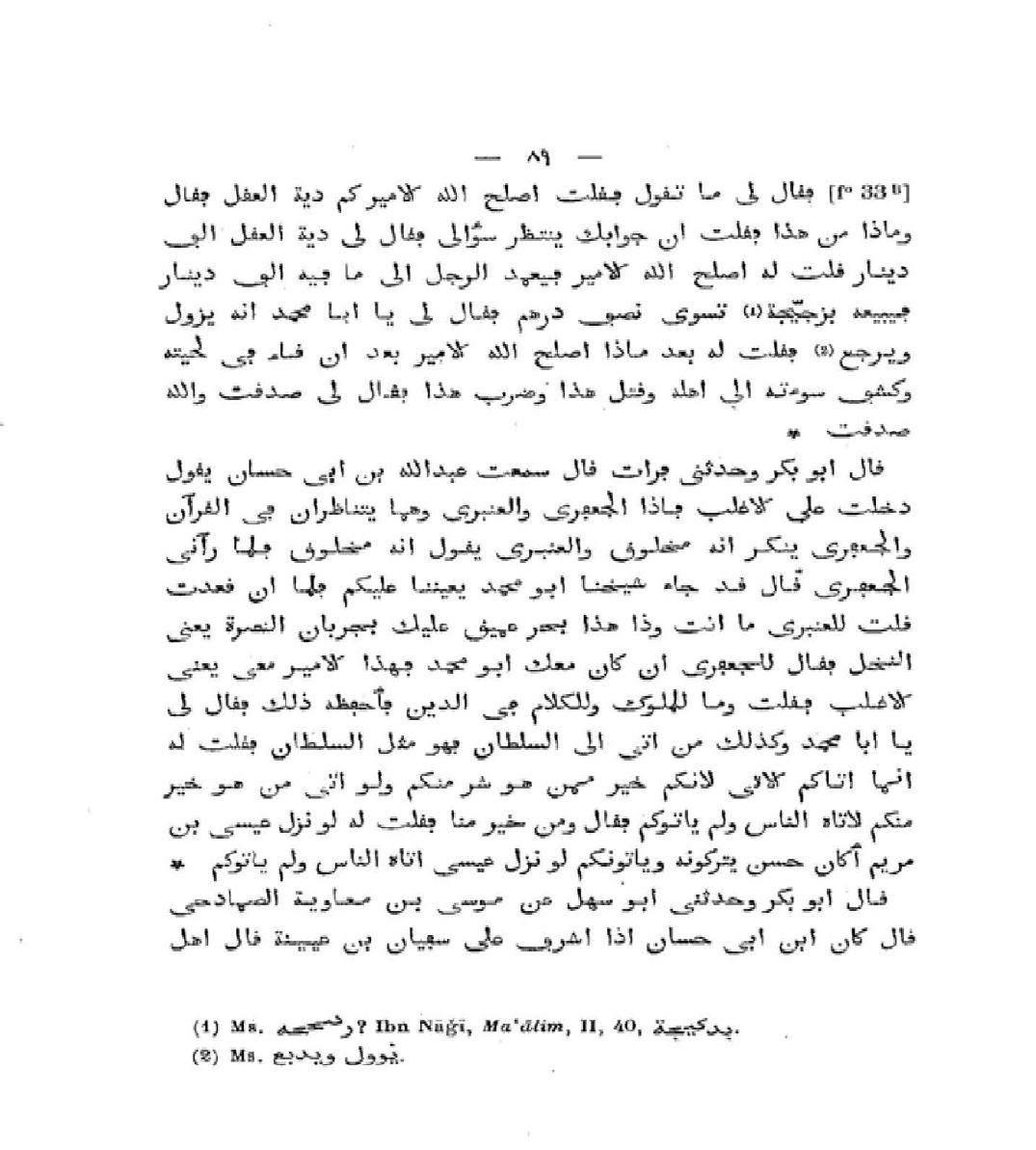 قَالَ أَبُو بَكْرٍ مُحَمَّدُ بْنُ مُحَمَّدٍ: وَحَدَّثَنِي فُرَاتُ بْنُ مُحَمَّدٍ، قَالَ: سَمِعْتُ عَبْدَ اللَّهِ بْنَ أَبِي حَسَّانٍ، يَقُولُ: دَخَلْتُ عَلَى الأَغْلَبِ زِيَادَةِ اللَّهِ بْنِ إِبْرَاهِيمَ فَإِذَا الْجَعْفَرِيُّ وَالْعَنْبَرِيُّ، وَهُمَا يَتَنَاظَرَانِ فِي الْقُرْآنِ، وَالْجَعْفَرِيُّ يُنْكِرُ أَنَّهُ مَخْلُوقٌ، وَالْعَنْبَرِيُّ يَقُولُ: إِنَّهُ مَخْلُوقٌ، فَلَمَّا رَآنِي الْجَعْفَرِيُّ، قَالَ: قَدْ جَاءَ شَيْخُنَا أَبُو مُحَمَّدٍ يُعِينُنَا عَلَيْكُمْ، فَلَمَّا أَنْ قَعَدْتُ قُلْتُ لِلْعَنْبَرِيِّ: مَا أَنْتَ وَذَا، هَذَا بَحْرٌ عَمِيقٌ عَلَيْكَ بِجِرْبَانِ الْبَصْرَةِ، يَعْنِي: النَّخْلَ، فَقَالَ لِلْجَعْفَرِيِّ: إِنْ كَانَ مَعَكَ أَبُو مُحَمَّدٍ فَهَذَا الأَمِيرُ مَعِي، يَعْنِي: الأَغْلَبَ، فَقُلْتُ: وَمَا لِلْمُلُوكِ وَلِلْكَلامِ فِي الدِّينِ؟ فَأَحْفَظَهُ ذَلِكَ، فَقَالَ لِي: يَا أَبَا مُحَمَّدٍ، وَكَذَلِكَ مَنْ أَتَى إِلَى السُّلْطَانِ فَهُوَ مِثْلُ السُّلْطَانِ، فَقُلْتُ لَهُ: إِنَّمَا أَتَاكُمُ الآتِي لأَنَّكُمْ خَيْرٌ مِمَّنْ هُوَ شَرٌّ مِنْكُمْ، وَلَوْ أَتَى مَنْ هُوَ خَيْرٌ مِنْكُمْ لأَتَاهُ النَّاسُ وَلَمْ يَأْتُوكُمْ، فَقَالَ: وَمَنْ خَيْرٌ مِنَّا؟ فَقُلْتُ لَهُ: لَوْ نَزَلَ عِيسَى ابْنُ مَرْيَمَ أَكَانَ حَسَنًا يَتْرُكُونَهُ وَيَأْتُونَكُمْ؟ لَوْ نَزَلَ عِيسَى أَتَاهُ النَّاسُ وَلَمْ يَأْتُوكُمْ.