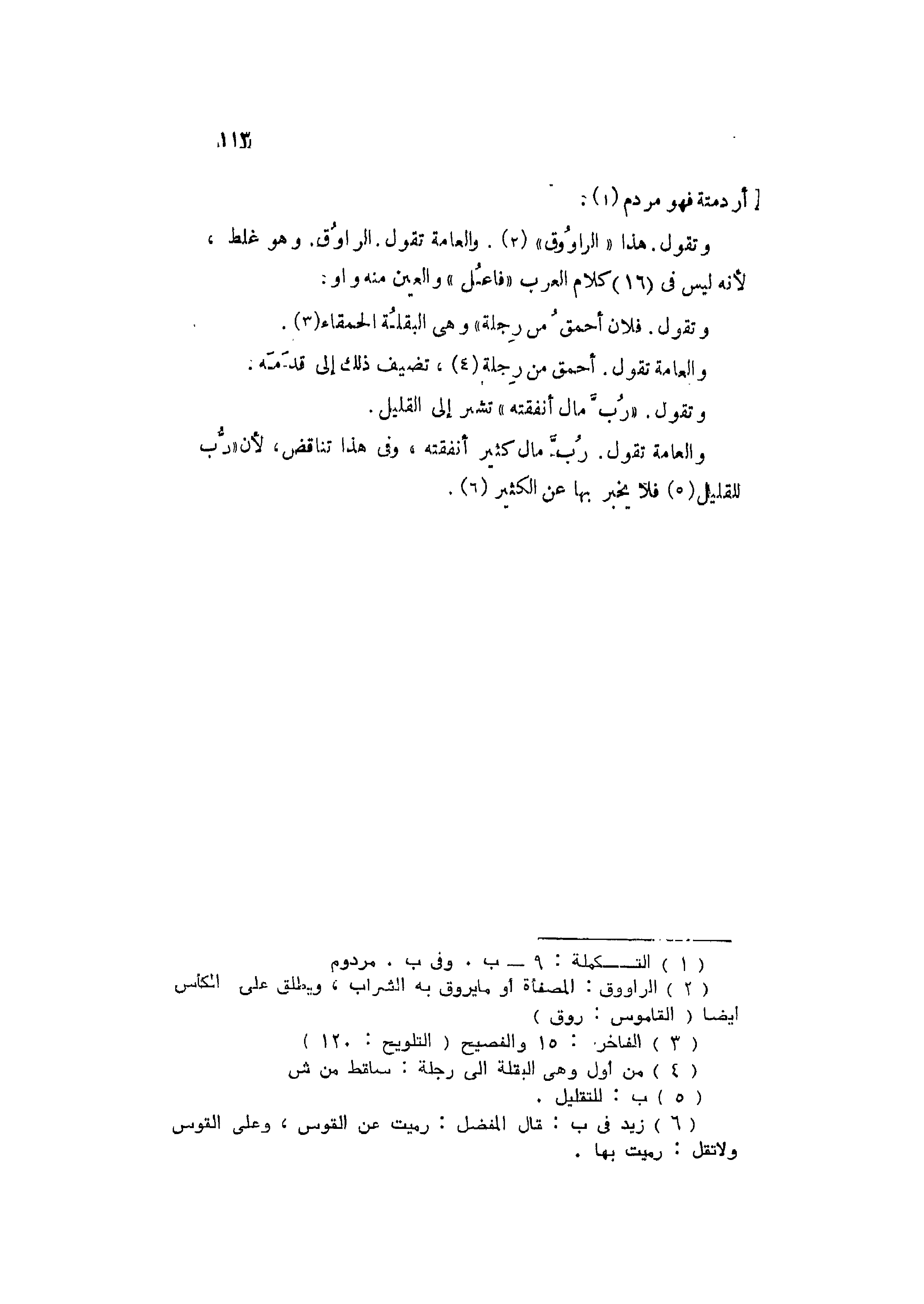 وتقول: هذا "الراوُوق". والعامة تقول: الراوُق. وهو غلط،