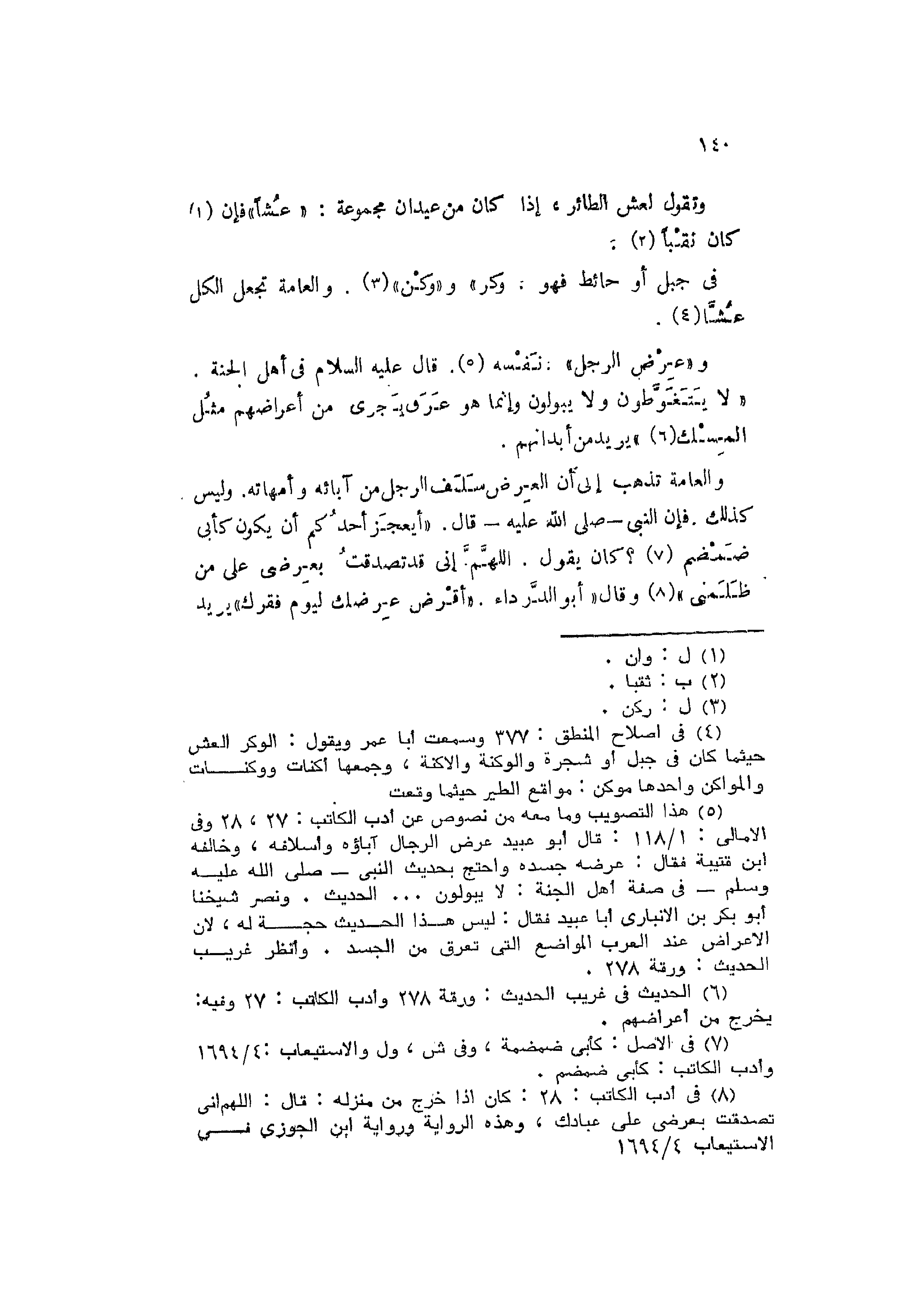 وتقول لعش الطائر إذا كان من عيدان مجموعة: "عُشًّا". فإن كان نقْبًا في جبل أو حائط فهو: "وكر" و "وكْن". والعامة تجعل الكل عُشًّا.