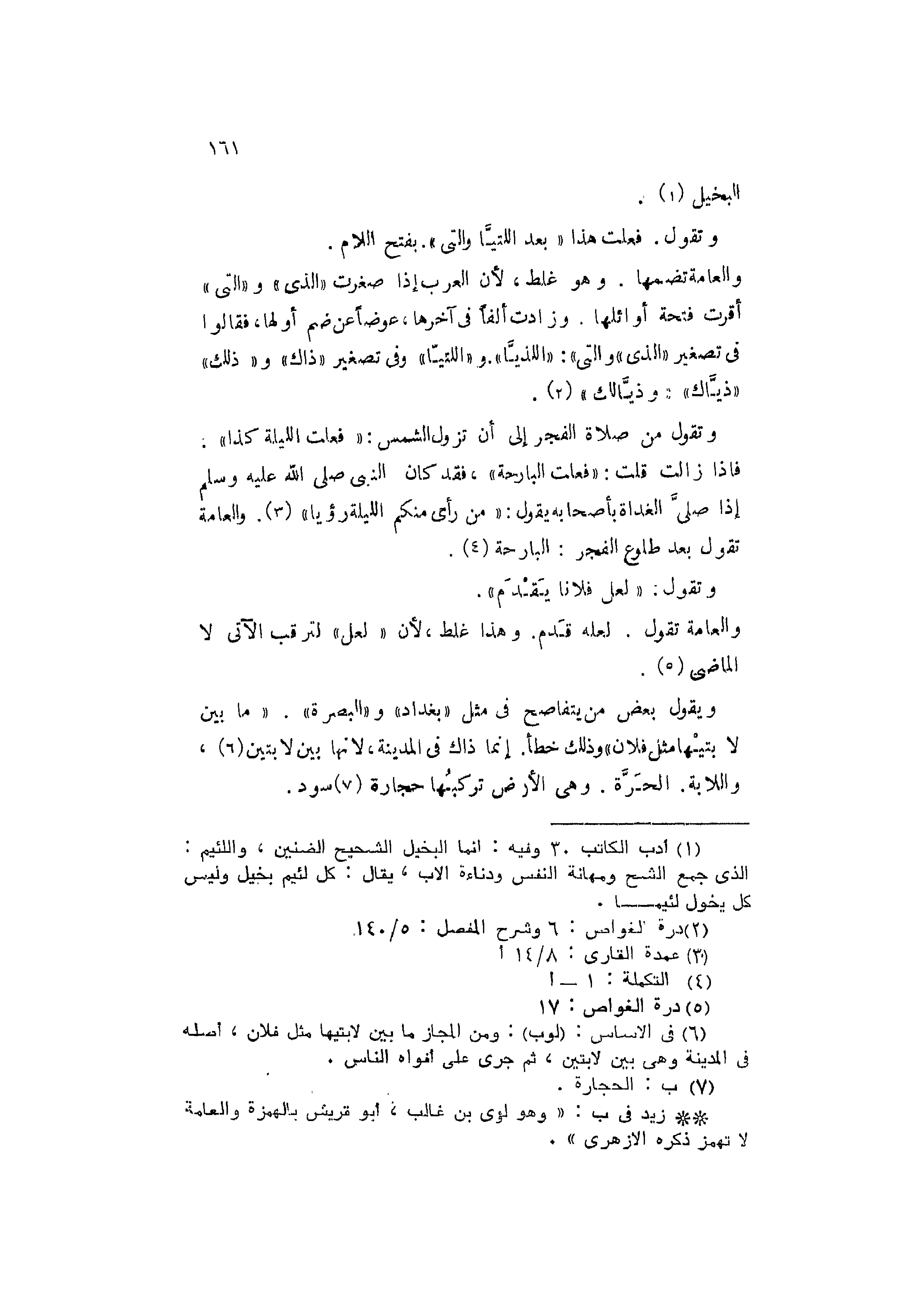 والعامة تضمها. وهو غلط، لأن العرب إذا صغرت "الذي" و "التي" أقرت فتحة أوائلها، وزادت ألفاً في آخرها، عوضاً عن ضم أولها، فقالوا في تصغير "الذي" و "التي": "اللذيَّا" و "اللتيَّا"، وفي تصغير "ذاك" و "ذلك": "ذيَّاك" و "ذيَّالك".