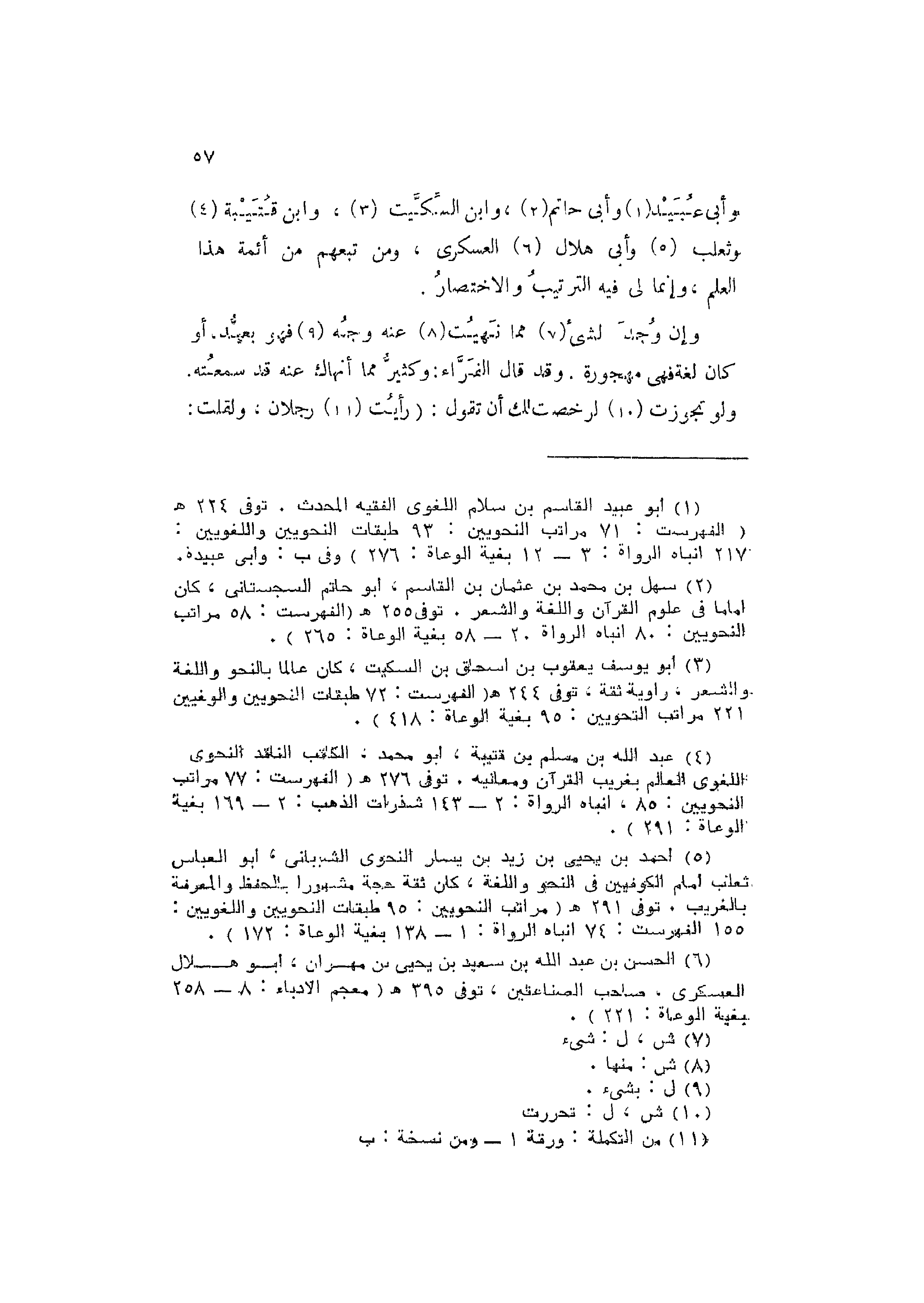 وأبي عُبَيْد، وأبي حاتم، وابن السِّكَّيت، وابن قُتَيْبة، وثعلب، وأبي هلال العسكري، ومن تبعهم من أئمة هذا العلم، وإنما لى فيه الترتيبُ والاختصارُ، وإن وجد لشيء مما نهيت عنه وجه فهو بعيد، أو كان لغة فهي مهجورة، وقد قال الفرَّاء: وكثيرُّ مما أنهاك عنه قد سمعتُه. ولو تجوزت لرخصت لك أن تقول: رأيتُ رجلان، ولقلت: