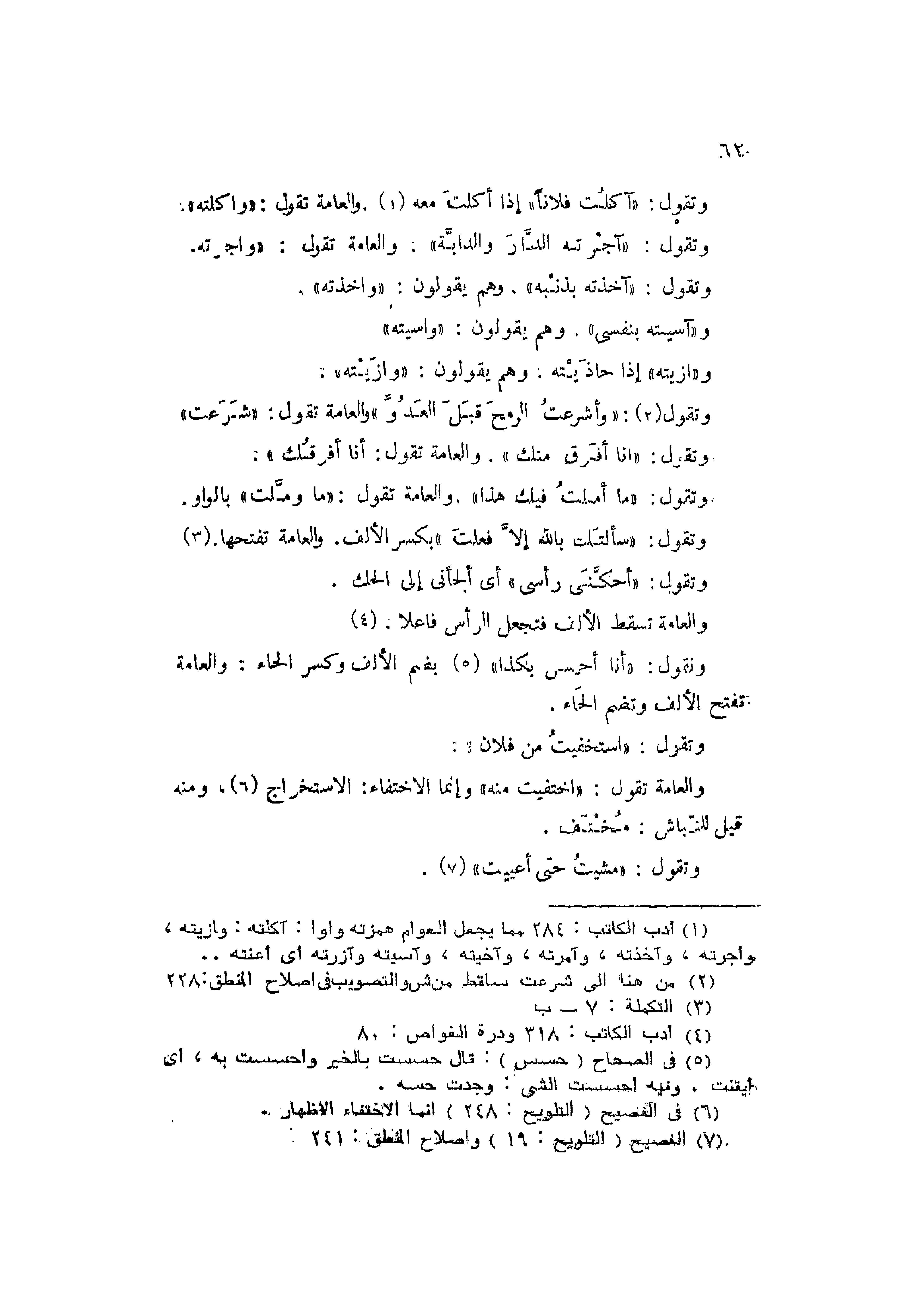 وتقول: "آكلتُ فلانًا" إذا أكلتَ معه. والعامة تقول: "واكلته".