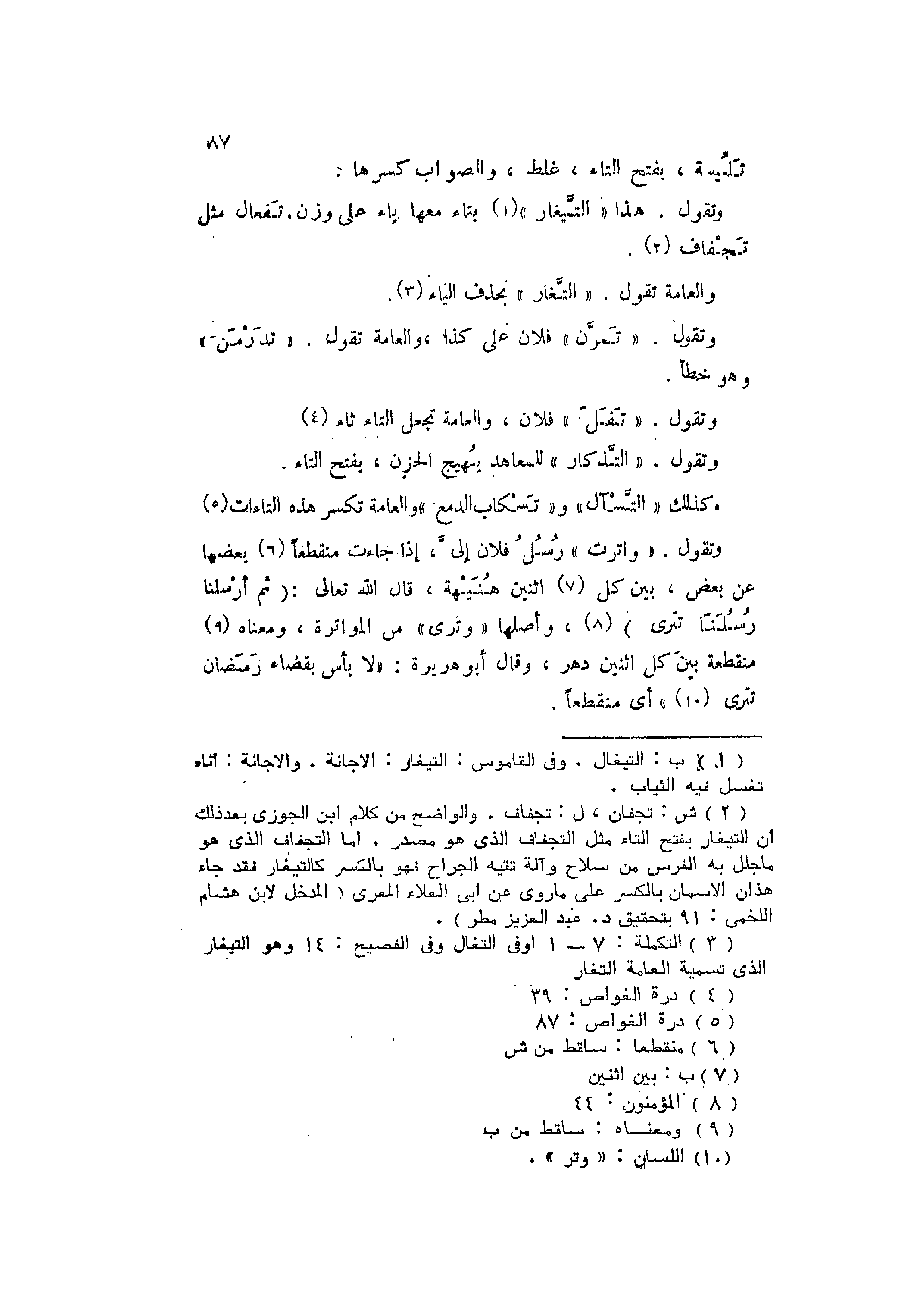 كذلك: "التَّسْآل" و "تَسْكاب الدمع" والعامة تكسر هذه التاءات.