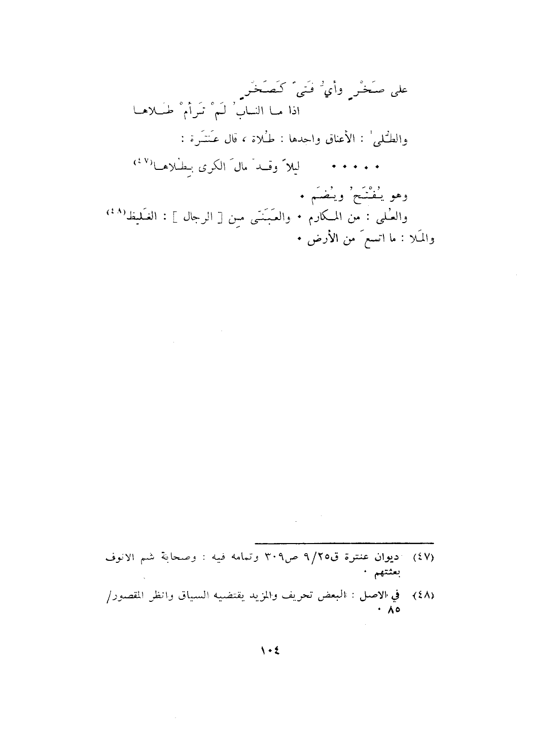 والطُّلَى: الأعناق واحدها: طُلَاة، قال عنترة: