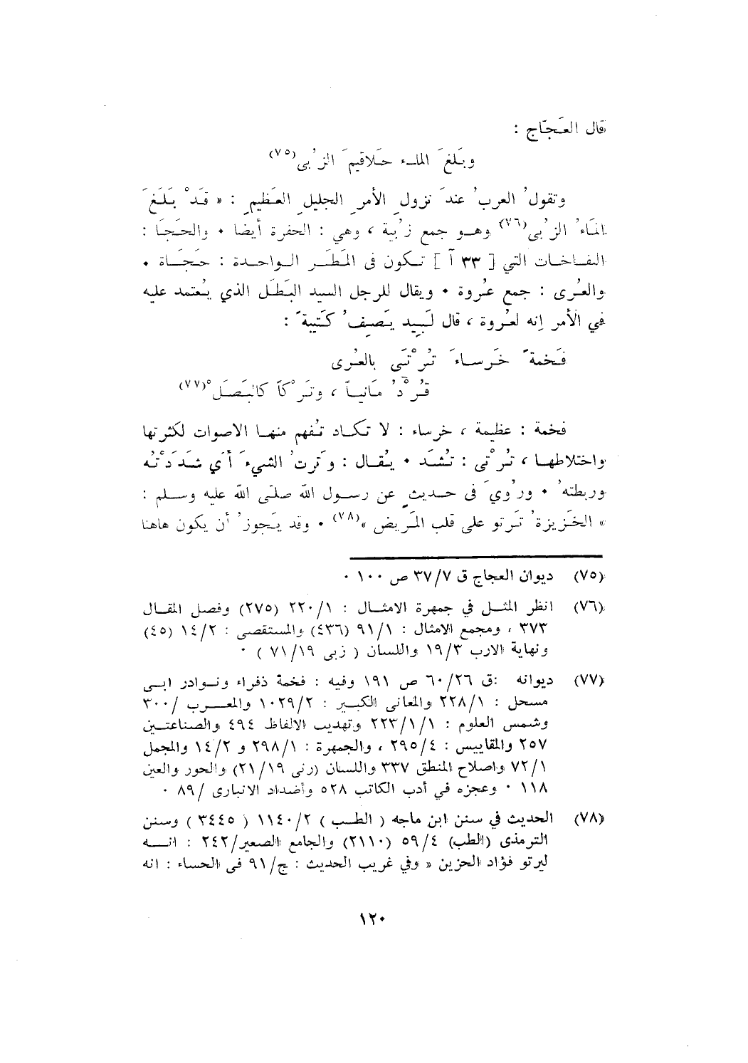وتقول العرب عند نزول الأمر الجليل العظيم: " قَدْ بَلَغَ الْمَاءُ الزُّبَى وهو جمع زبية، وهي: الحفرة أيضًا. والحجا: الفاخات التي [33 آ] تكون في المطر الواحدة: حجاة.