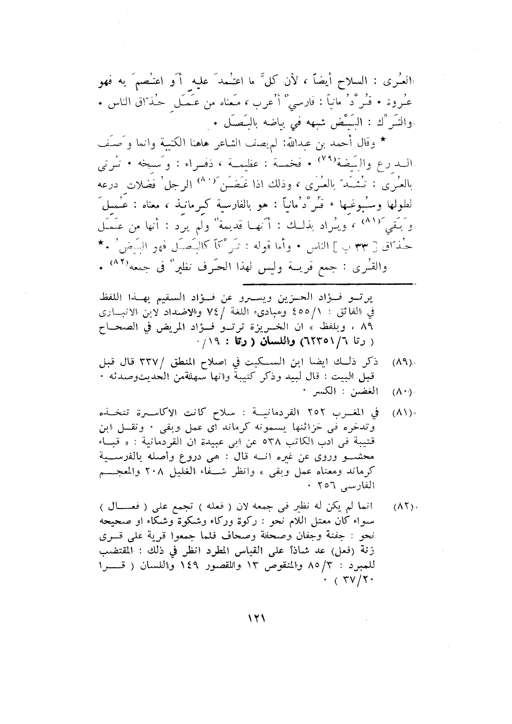 العُرَى: السلاح أيضًا، لأن كلَّ ما اعْتُمِدَ عليه أو اعْتُصِمَ به فهو عُرْوَة. قردمانيا: فارسيٌّ أعرب، معناه من عمل حُذَّاق الناس. والترك: البيض شبهه في بياضه بالبصل.