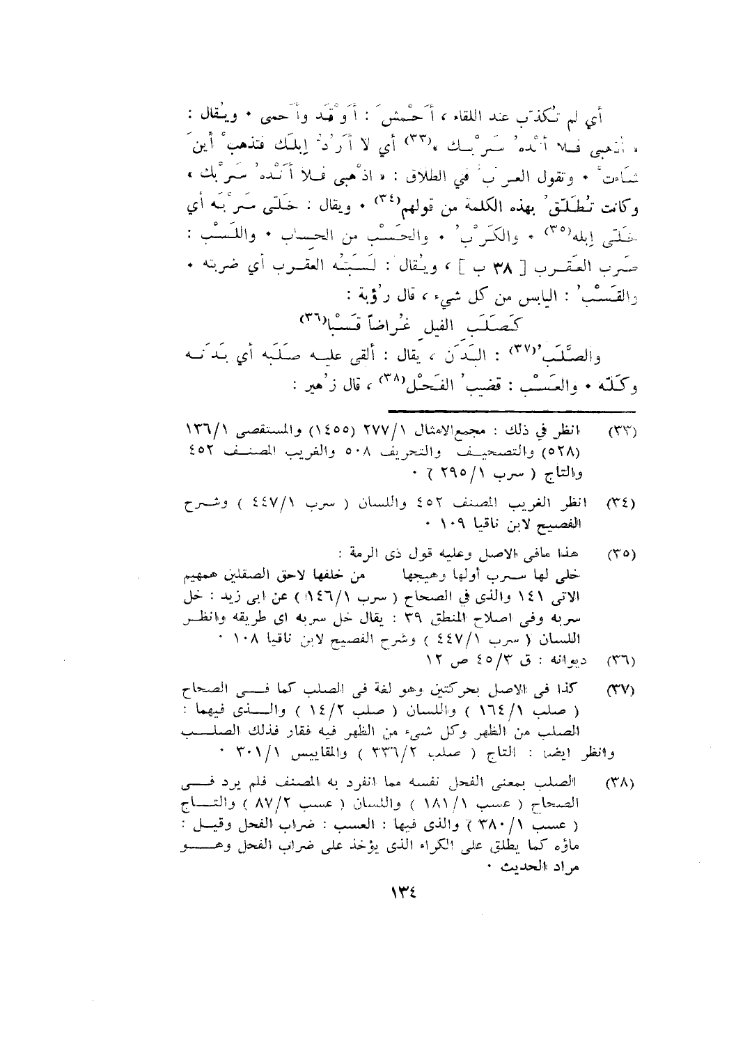 أي: لم تُكَذِّبْ عِنْدَ اللِّقَاءِ، أَحْمشَ: أَوْقَدُوا وَأَحْمَى. ويقال: " اذْهَبِي فَلَا أنده سربك " أي: لا أَرُدُّ إِبلك فتذهب أين شاءت. وتقول العرب في الطلاق: " اذْهَبِي فَلَا أَنْدَهُ سَرْبك " وكانت تطلق بهذه الكلمة من قولهم. ويقال: خلى سربه؛ أي: خلى إبله. والكَرْبُ. والحَسْبُ من الحساب. واللَّسْبُ: صرب العقرب [38 ب]، ويقال: لَسَبْتُهُ العقرب؛ أي: ضَرَبْتُهُ. والقَسْبُ: اليابس من كل شيء، قال رؤبة: