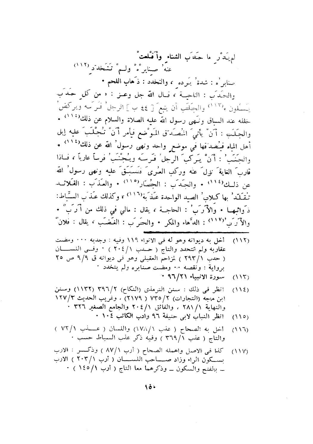 والجَنَبُ: أنْ يَرْكِبَ الرجل فرسه ويُجْنَبُ فَرَسًا عَارِيًا، فإذا قارب الغاية نزل عنه وركب العرى فَسَبَقَ عَلَيْهِ وَنَهَى رسولُ الله عن ذلك. والجدب: الجُمَّار. والعَذَب: القَلَائد: تُقَلَّدُ بها كلاب الصيد، الواحدة عذبة، وكذلك عذب السياط: ذَوَائِبُهَا. والأَرَبُ: الحاجة، يقال: مالي في ذلك من أَرَبٌ.