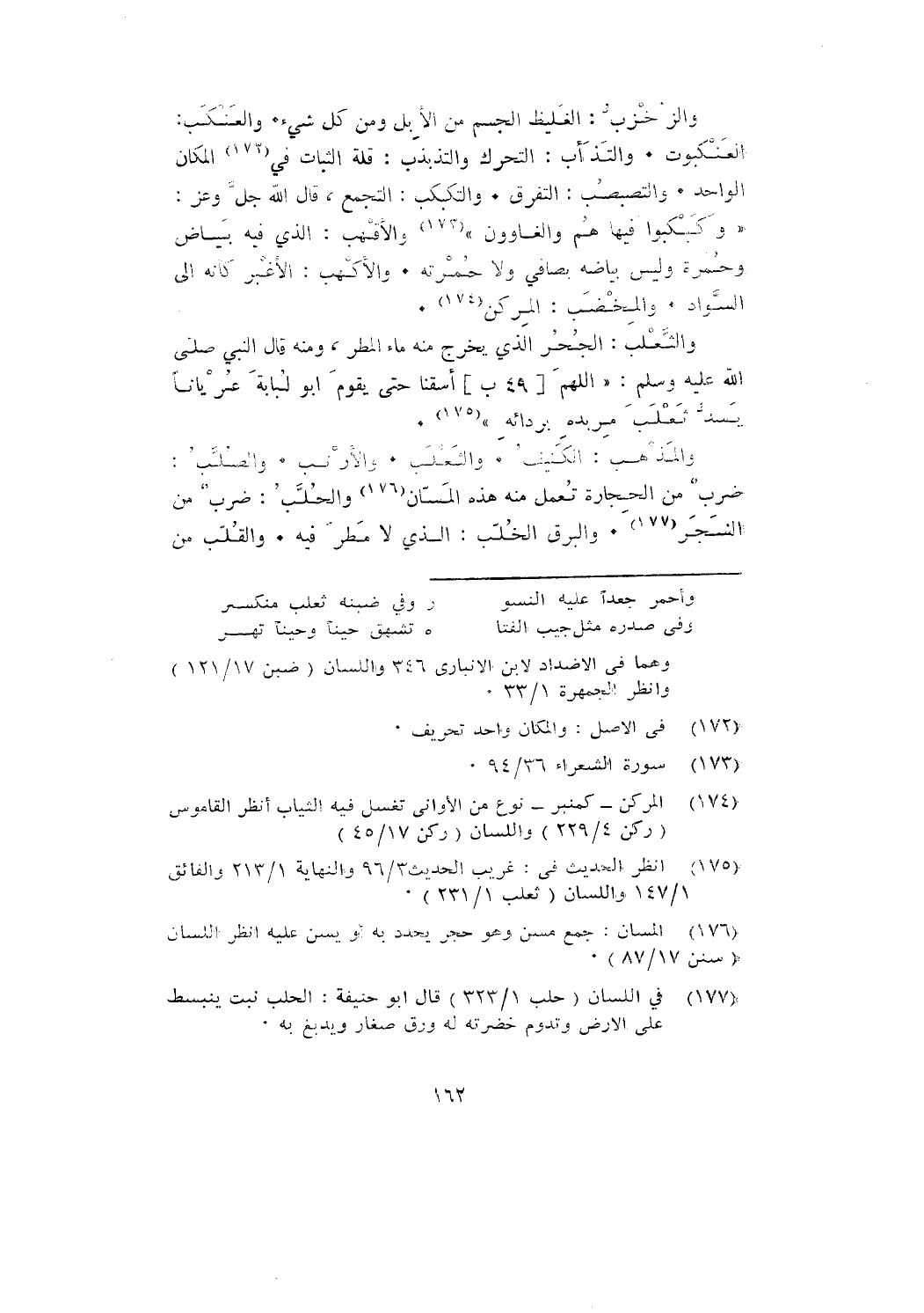 والزُّخْزبُّ: الغليظ الجسم من الإبل ومن كل شيء، والعَنْكَب: العنكبوت. والتَّذَأب: التَّحَرُّك والتَّذَبْذُب: قلة الثبات في المكان الواحد. والتَّصَبْصُبُ: التفرق. والتكبكب: التجمع، قال الله جل وعز: {فَكُبْكِبُوا فِيهَا هُمْ وَالْغَاوُونَ} والأَقْهَبُ: الَّذِي فيه بياض وحمرة وليس بياضه بصافٍ ولا حمرته. والأكهب: الأغبر كأنه إلى السواد. والمخضب: المركن.