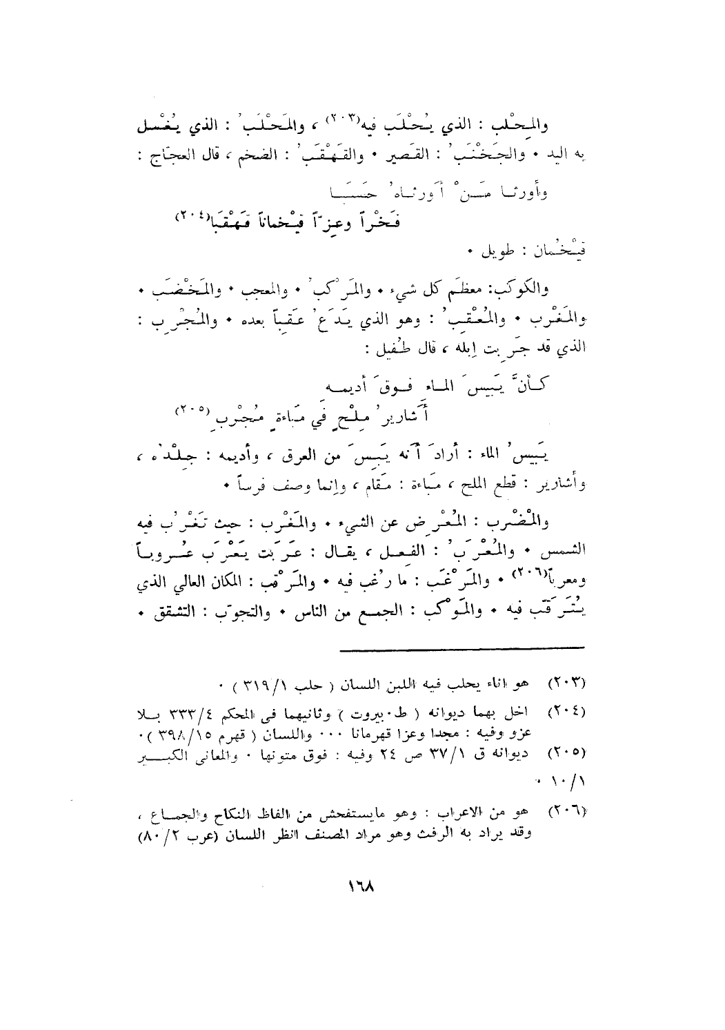 والمِحْلب: الذي يُحْلَب فيه، والمَحْلَبُ: الذي يُغْسَلُ به اليد. والجَخْنَبُ: القصير. والقَهْقَبُ: الضخم، قال العجاج: