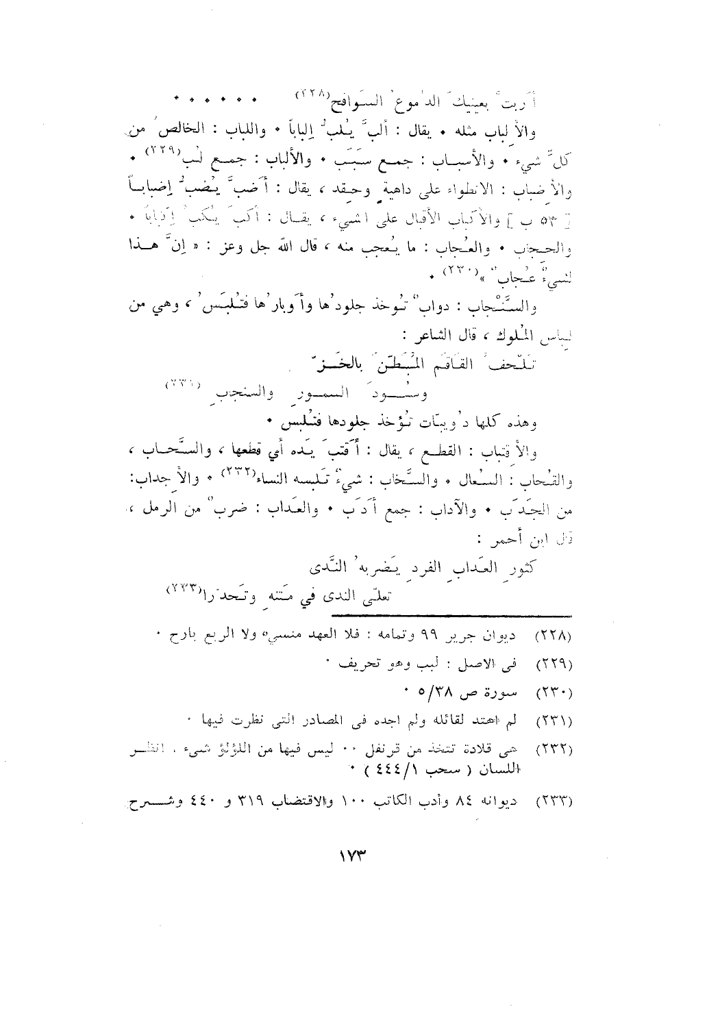 والإقتباب: القطع، يقال: أقتب يده؛ أي: قطعها، السَّحَاب، والقُحَابُ: السُّعَالُ. والسَّخَابُ: شيء تلبسه النساء. والإجداب: من الجَدَبِ. والآداب: جمع أدب. والعَدَاب: ضَرْبٌ مِنَ الرَّمْلِ، قال ابن أحمر: