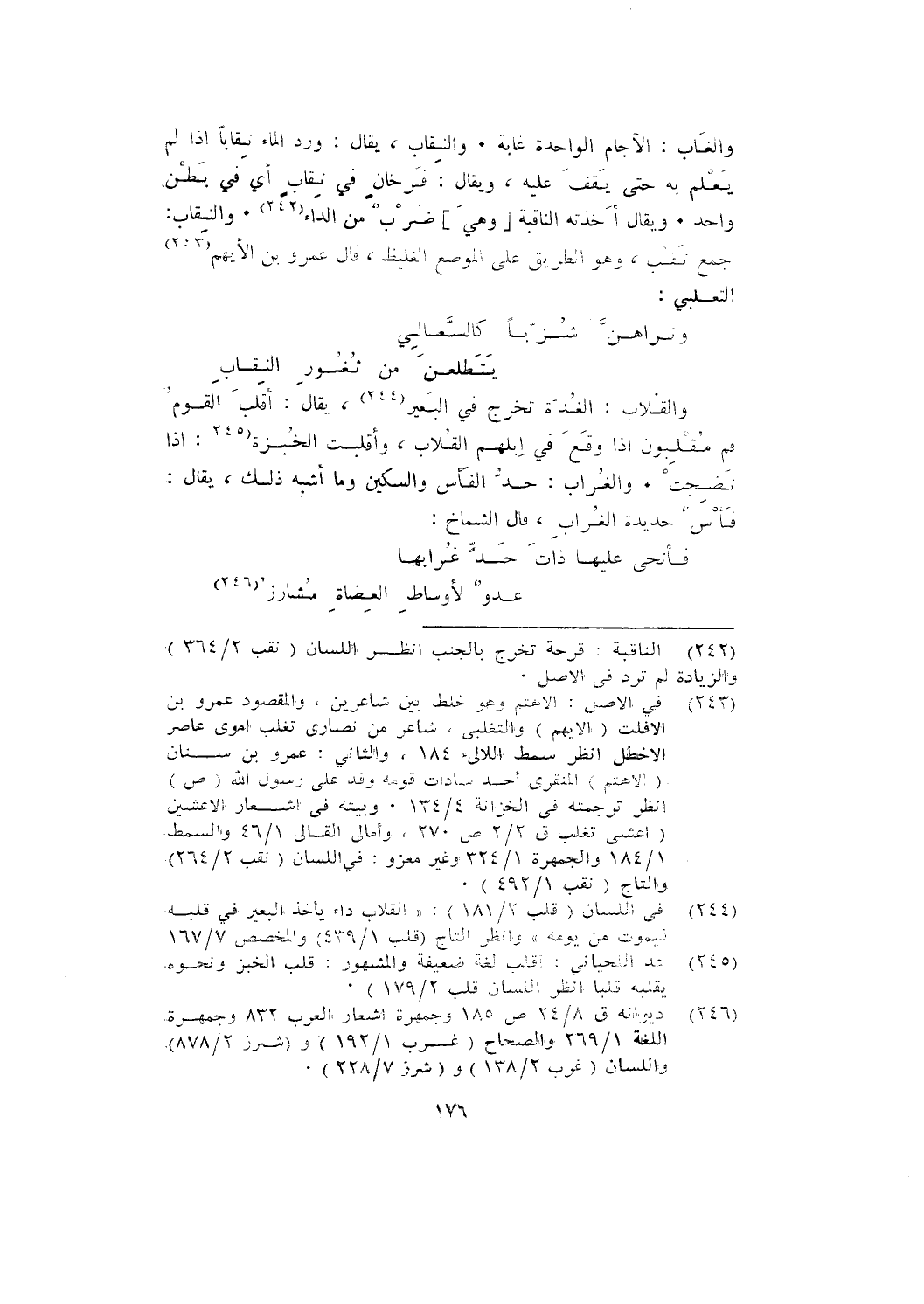 والغَابُ: الآجام الواحدة غابة. والنِّقَابُ، يقال: ورد الماء نِقَابًا إذا لم يَعْلَمْ به حتى يقف عليه، يقال: فرخان في نِقَابٍ؛ أي: في بطن واحد. ويقال أخذته الناقبة [وهي] ضَرْبٌ مِنَ الدَّاءِ. والنِّقَابُ: جمع نقب، وهو الطريق على الموضع الغليظ، قال عمرو بن الأيهم الثعلبي:
