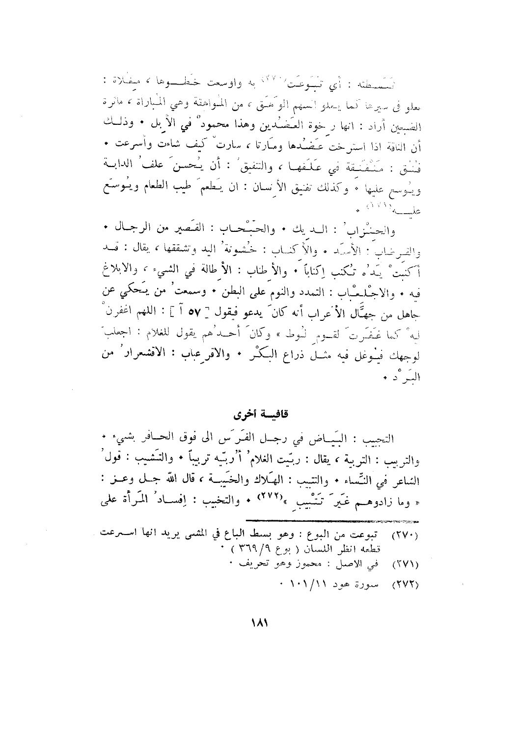 والقِرْضَابُ: الأَسَدُ. والإِكْنَابُ: خُشُونَةُ الْيَدِ وَتَشَقُّقُهَا، يقال: قد أكنبت يَدُهُ تُكْنَبُ إِكْنَابًا. والإِطْنَابُ: الإطالة في الشيء، والإبلاغ فيه. والاجْلِعْبَابُ: التمدد والنوم على البطن. وسمعت من يحكي عن جاهل من جُهَّال الأعراب أنه كان يدعو فيقول [57 آ]: اللهم اغفرن ليه كما غفرت لقوم لوط " وكان أحدهم يقول للغلام: اجْلَعِبَّ لوجهك فيوغل فيه مثل ذراع البكر. والاقرعباب: الاقشعرار من البرد.