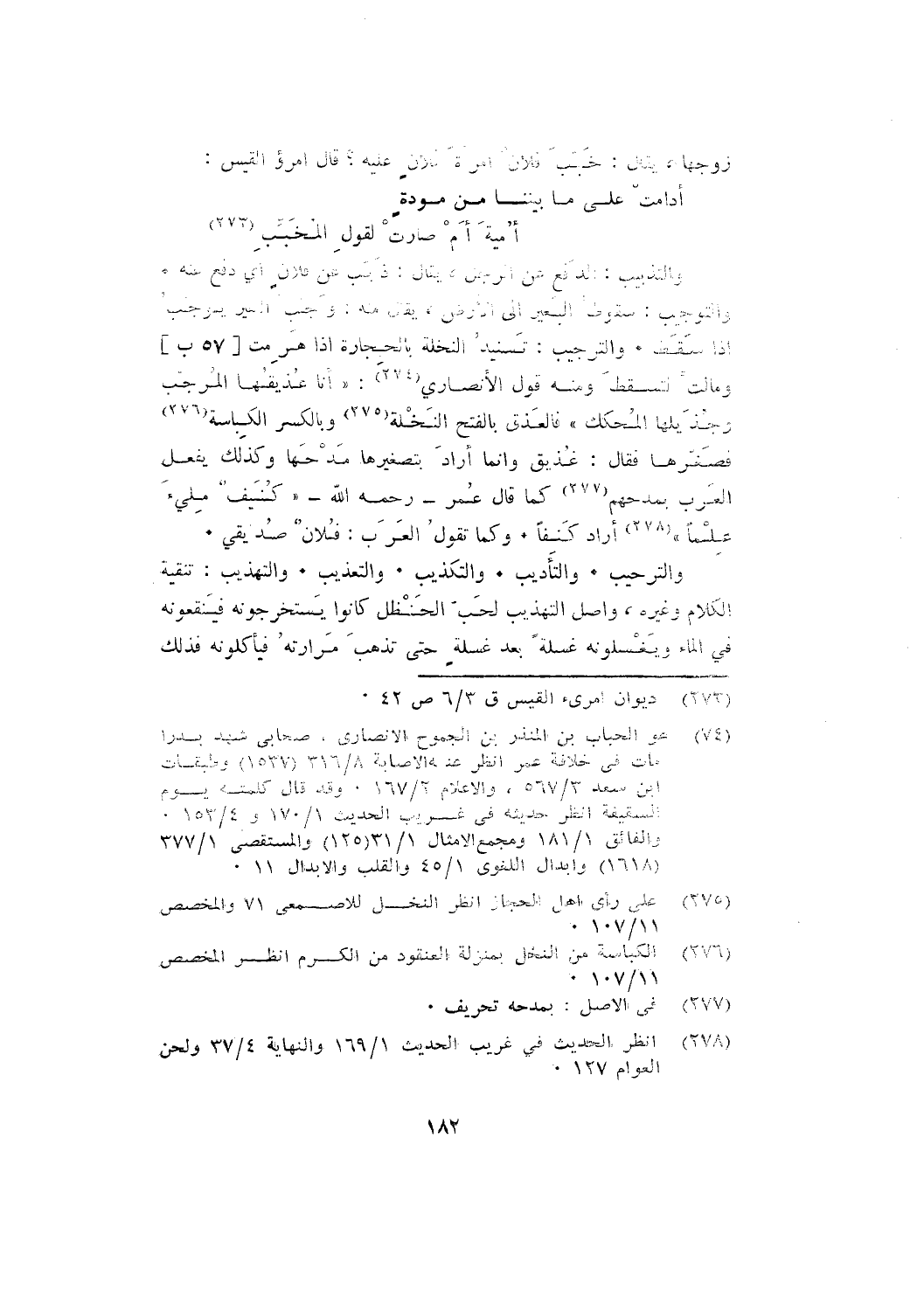 والتَّوْجِيبُ: سقوط البعير إلى الأرض، يقال منه: وجب البعير يوجب إذا سقط. والترجيب: تسنيد النخلة بالحجارة إذا هرمت [57 ب] ومالت فتسقط ومنه قول الأنصاري: " أنا عذيقها المُرَجَّب وجُذَيلها المُحكك " فالعَذْق بالفتح النَّخْلَة وبالكسر الكِبَاسة فَصَغَّرَهَا فقال: عُذيق وإنما أراد بتصغيرها مدحها وكذلك يفعل العرب بمدحهم كمال قال عمر- رحمه الله -: " كُنَيْفٌ مليء عِلْمًا " أراد كَنِفًا. وكما تقول العرب: فُلَانٌ صُدَيْقِي.