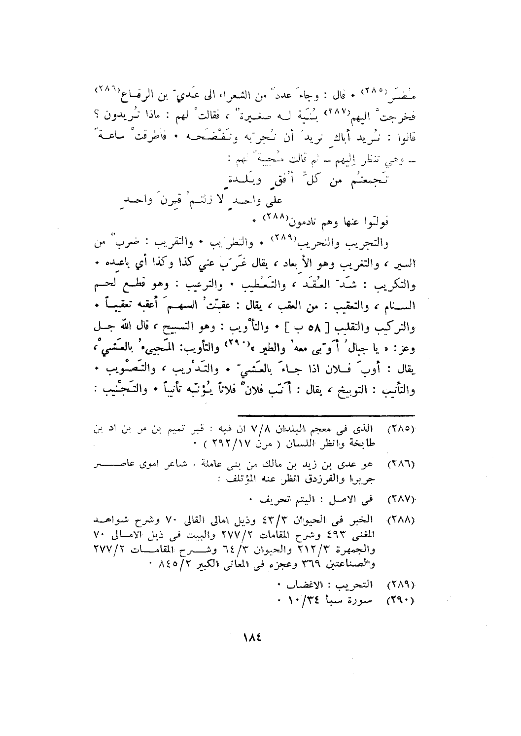 والتركيب والتقليب [58 ب]. والتأويب: وهو التسبيح، قال الله جل وعز: {يَاجِبَالُ أَوِّبِي مَعَهُ وَالطَّيْرَ} والتَّاوِيبُ: المَجِيئُ بالعَشِيِّ، يقال: أَوَّبَ فُلَانٌ إذا جاء بالعَشِيِّ. والتدريب، والتَّصْوِيبُ.