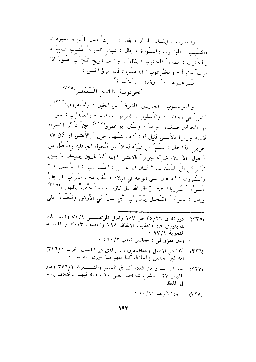 والسرحوب: الطويل المشرف من الخيل. والمَخروب: الشَّقُّ في الحائط. والأسلوب: الطريق المسلوك. والعَندليب: ضَرْبٌ مِنَ الْعَصَافِيرِ صِغَارٌ جِدًّا. وسئل أبو عمرو حين ذُكِر الشُّعَرَاءُ فَشَبَّهَ جَرِيرًا بِالْأَعْشَى؛ فقيل له: كيف شَبَّهْتَ جَرِيرًا بِالْأَعْشَى أَوْ كَانَ عند جرير هذا؛ فقال: نَعَمْ مَنْ شَبَّهَ فَحْلًا مِنْ فُحُولِ الْجَاهِلِيَّةِ بِفَحْلٍ مِنْ فُحُولِ الْإِسْلَامِ شَبَّهَ جَرِيرًا بِالْأَعْشَى إِنَّهُمَا كَانَا بَازِيَيْنِ يَصِيدَانِ مَا بَيْنَ الْكركى إلى العندليب * قال أبو عمر: العَندليبُ: البُلْبُل.