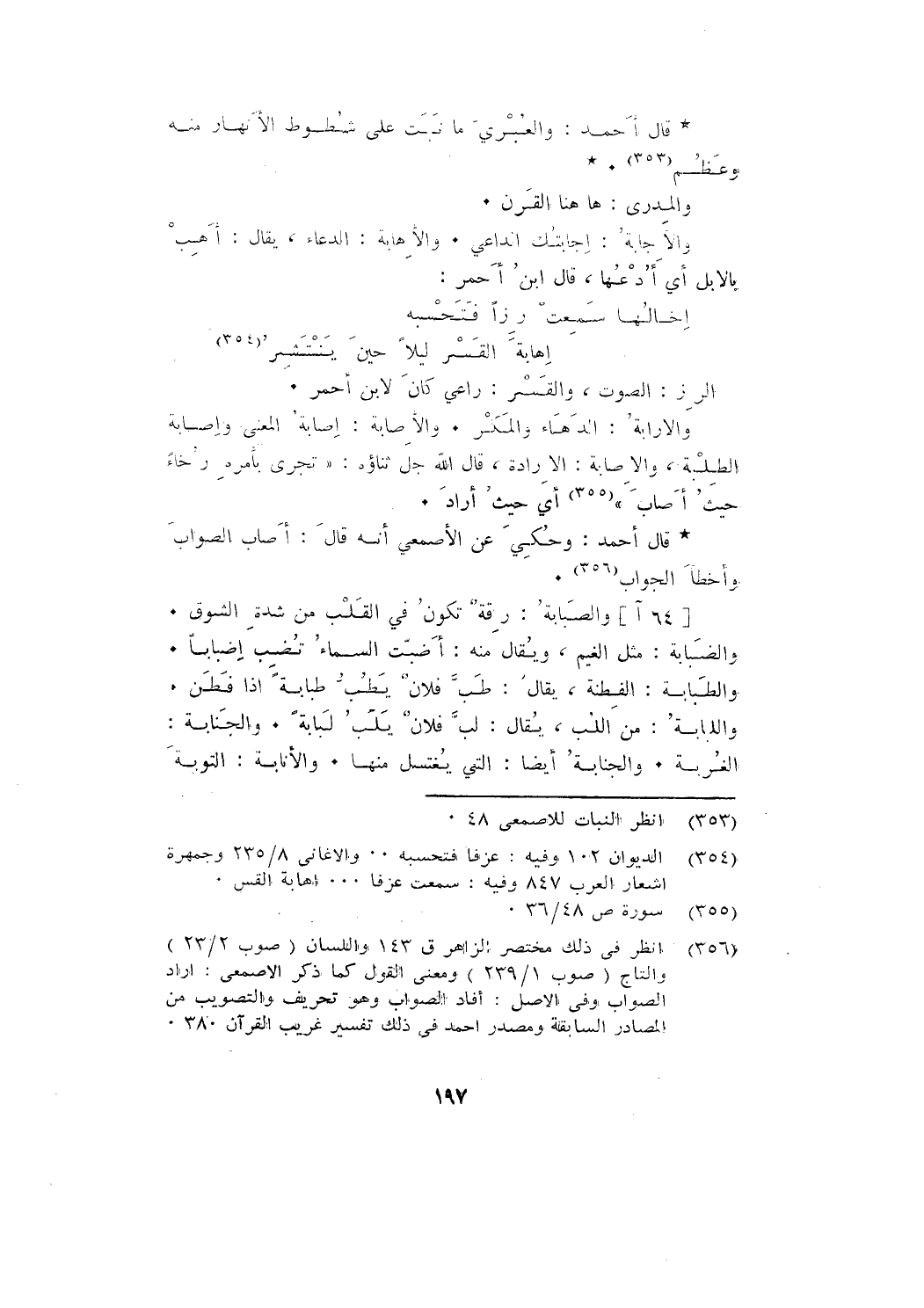 * قال أحمد: وحكي عن الأصمعي أنه قال: أصاب الصواب وأخطأ الجواب.