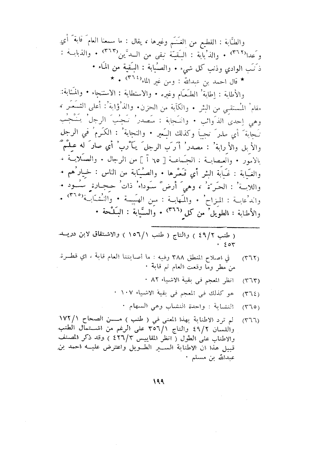 والطَّابة: القطيع من الغنم وغيرها، يقال: ما سمعنا العام قابةً؛ أي: وعدًا. والذُّبَابَة: البقيَّة تبقى من الدَّين. والذبابة: ذنب الوادي وذنب كل شيء. والصُّبَابَة: البقية من الماء.