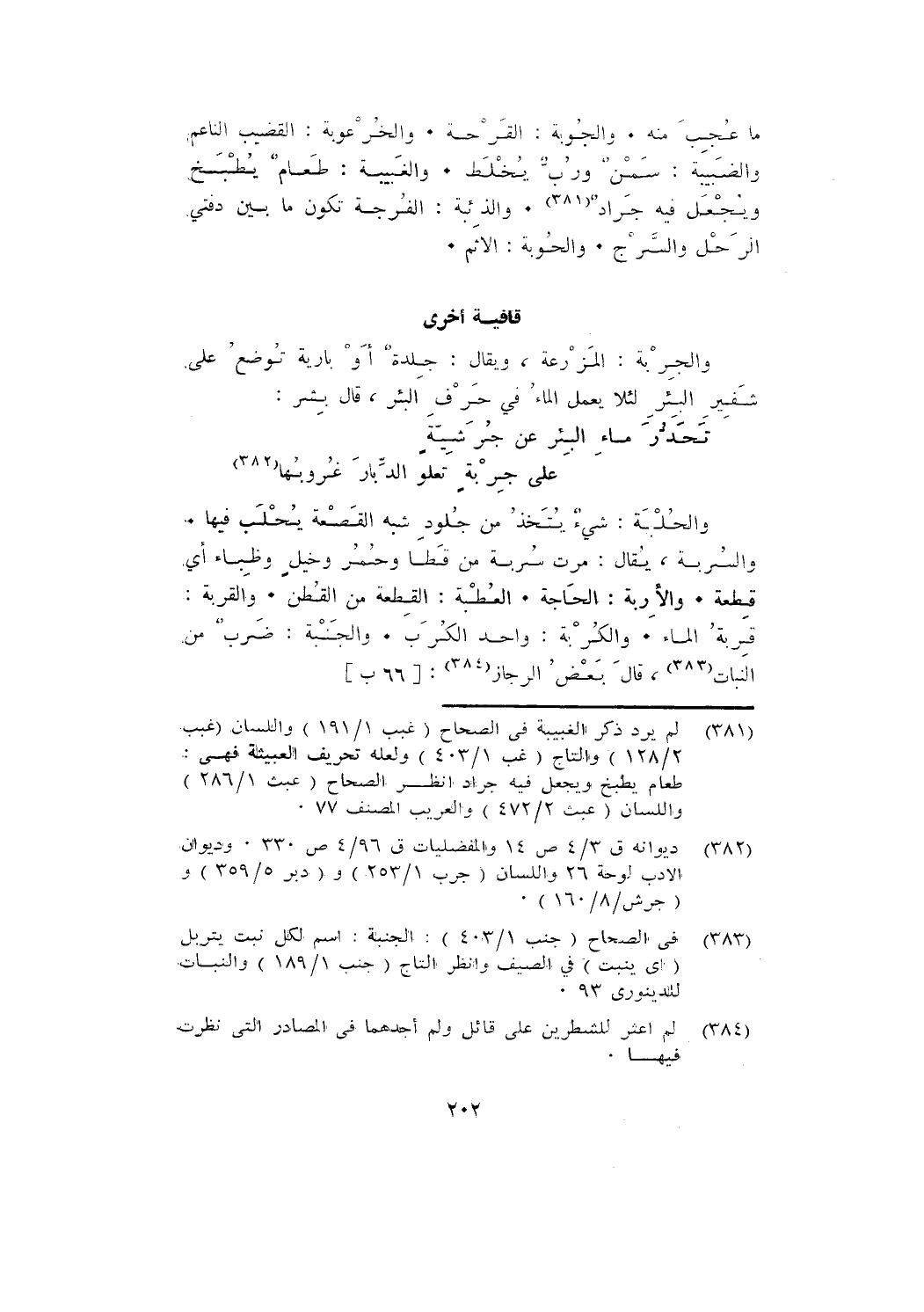 ما عُجِبَ مِنْهُ. والجُوبَةُ: القَرْحَة. والخُرْعُوبة: القَضِيبُ النَّاعِم. والضبيبة: سَمْنٌ وَرُبٌّ يُخْلَط. والغَبِيبة: طَعَامٌ يُطْبَخُ ويُجْعَلُ فيه جَرَادٌ. والذِّئْبة: الفُرْجة تكون ما بين دفتي الرَّحْلِ والسَّرْج. والحُوبة: الإثم.