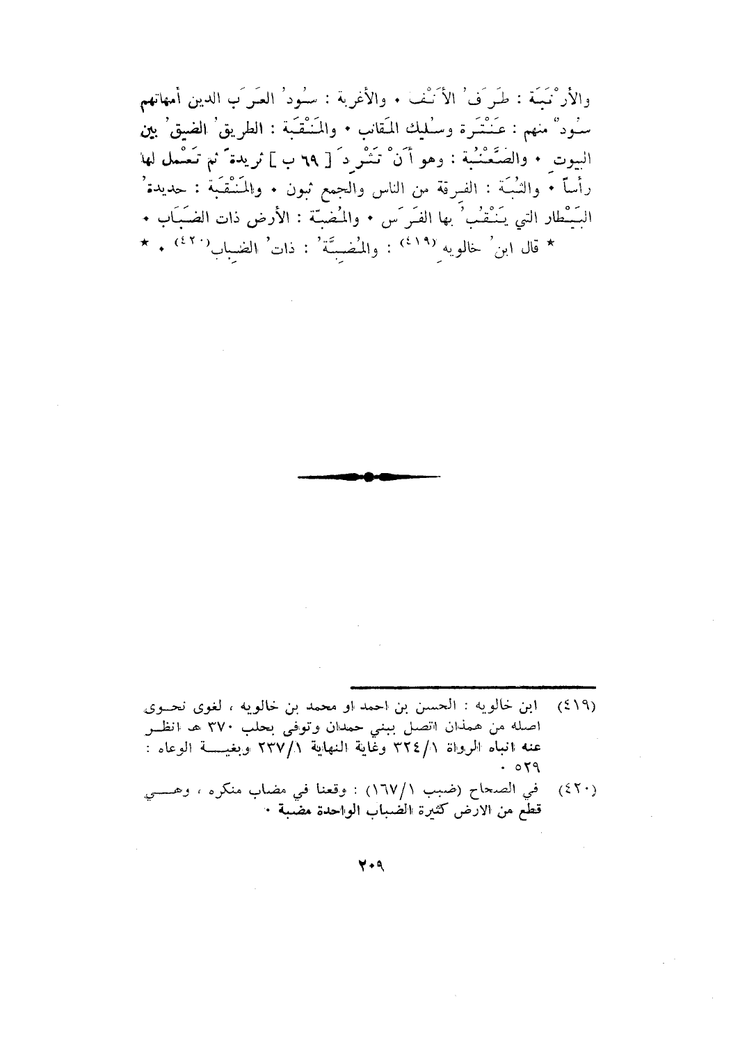 والأَرْنَبَةُ: طرف الأنف. والأغربة: سُودُ الْعَرَب الَّذِين أمهاتهم سود؛ منهم: عنترة، وسليك المقانب. والمَنْقَبَة: الطريق الضيق بين البيوت. والصَّعْنُبَة: وهو أن تَثْرِدَ [69 ب] ثَرِيدَةً ثُمَّ تَعْمَل لها رأسًا. والثُّبَة: الفرقة من الناس والجمع ثبون. والمَنْقَبَةُ: حديدةُ البَيْطَارُ التي يَنْقُبُ بِهَا الفَرَسُ. والمُضَبَّة: الأرض ذات الضَّبَابِ.