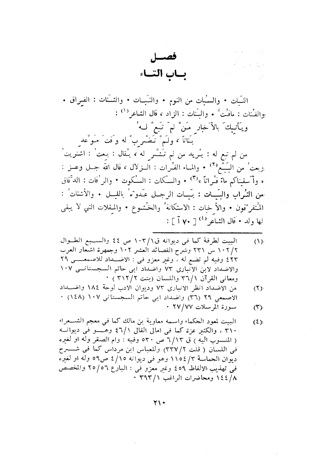 مَنْ لَمْ تبع له: يريد من لم تَشْرِ له، يقال: بِعْتُ: اشْتَرَيْتُ وبِعْتُ مِنَ الْبَيْعِ. والماء الفُرَات: الزلال، قال الله جل وعز: {وَأَسْقَيْنَاكُمْ مَاءً فُرَاتًا}. والسُّكَات: السُّكُوت. والرُّفَاتُ: الدِّقَاقُ من التُّرَابِ والبَيَات: بَيَات الرَّجُلِ عَدُوُّهُ بِاللَّيْلِ. والأَشْتَاتُ: المُتَفَرِّقُونَ. والإِخْبَاتُ: الاسْتِكَانَةُ والخُشُوعُ. والمِقْلات التي لا يبقى لها ولد. قال الشاعر [70 آ]: