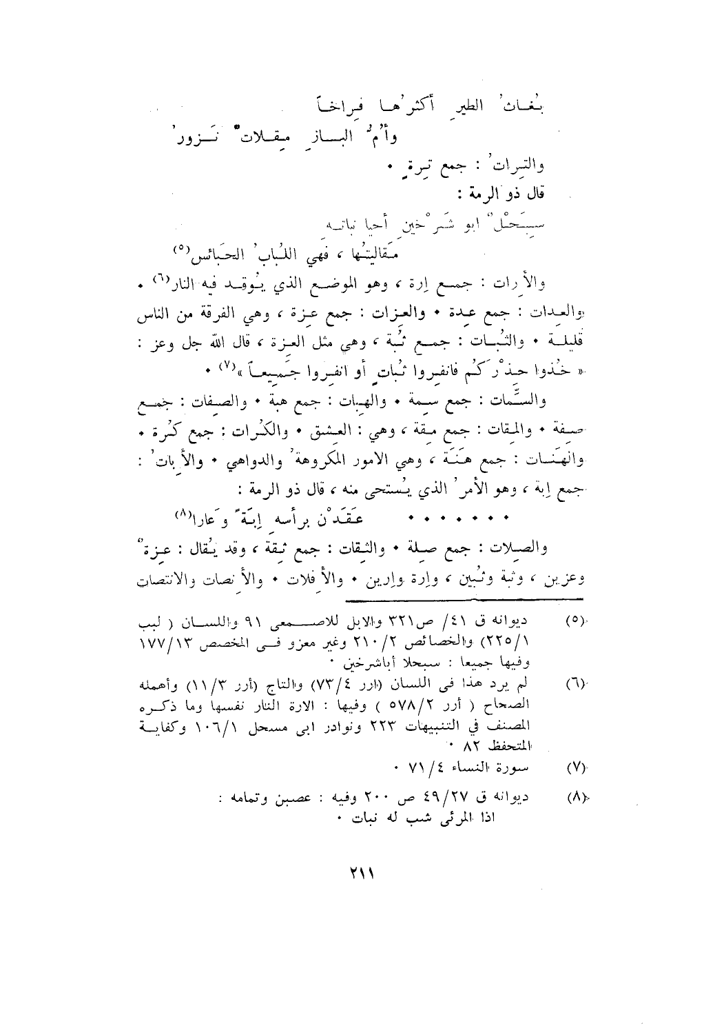 والإِرَات: جمع إرة، وهو الموضع الذي يُوقَدُ فِيهِ النار. والعِدَاتُ: جمع عِدة. والعِزَات: جمع عِزَة، وهي الفرقة من الناس قليلة. والثُّبَاتُ: جمع ثُبَةُ، وهي مثل العزة، قال الله جل وعز: {خُذُوا حِذْرَكُمْ فَانْفِرُوا ثُبَاتٍ أَوِ انْفِرُوا جَمِيعًا}.