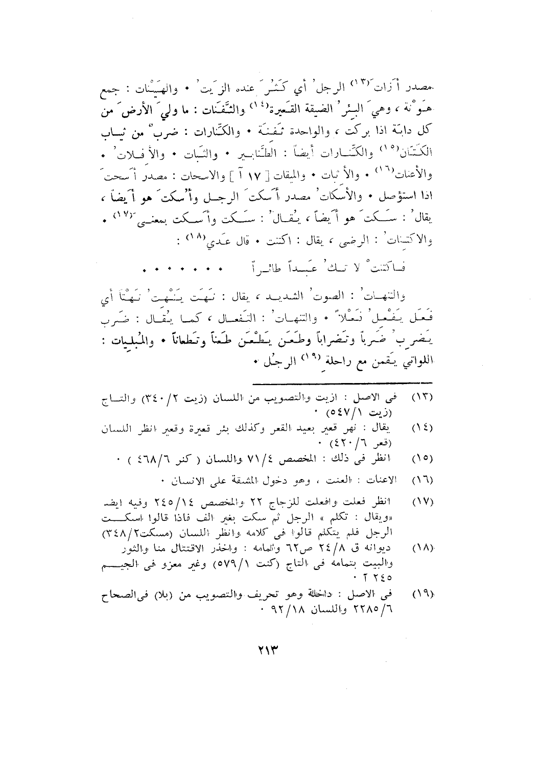 مصدر أَزَات الرجل؛ أي: كثر عنده الزَّيْتُ. والهَيْنَات: جمع هَوْنَة، وهي البِئْرُ الضَّيِّقَةُ القَعِيرَةُ. والثَّفَنَات: ما ولي الأرض من كل دابَّة إذا بَرَكَت، والواحدة ثَفِنَة. والكنَّارات: ضرب من ثياب الكَتَّان. والكِنَّارات أيضًا: الطنابير. والثبات. والإِفْلَاتُ. والأعنات. والإثبات. والميقات [17 آ] والإسحات: مصدر أسحت إذا استؤصل. والإسكات مصدر أسكت الرجل وأُسْكِتَ هو أيضًا، يقال: سَكَتَ هُوَ أيضًا: سكت وأسكت بمعنى.