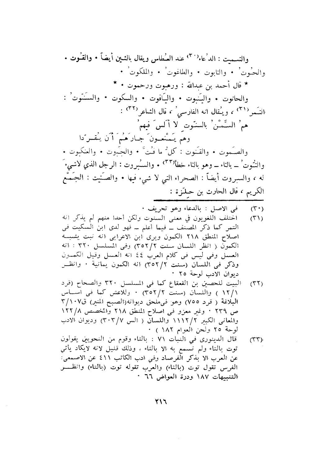 والتسميت: الدُّعَاءُ عند العطاس ويقال بالشين أيضًا. والقُوت. والحُوتُ. والتَّابُوتُ. والطَّاغُوتُ. والمَلَكُوتُ.
