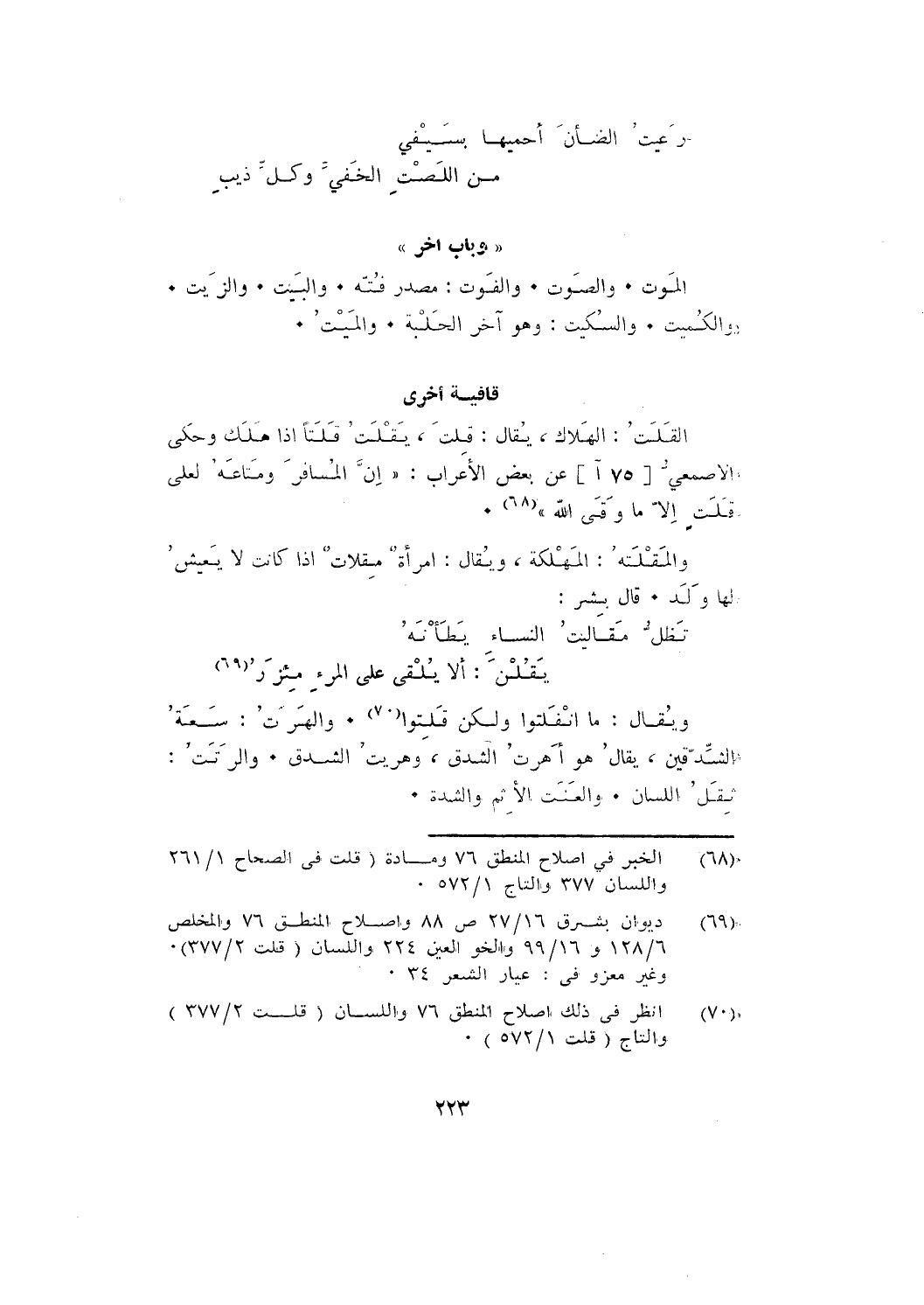 المَوْتُ. والصَّوْتُ. والفَوْتُ: مصدر فُتُّه. والبَيْتُ. والزَّيْتُ. والكُمَيْتُ. والسُّكَيْتُ: وهو آخر الحَلْبَة. والمَيْتُ.