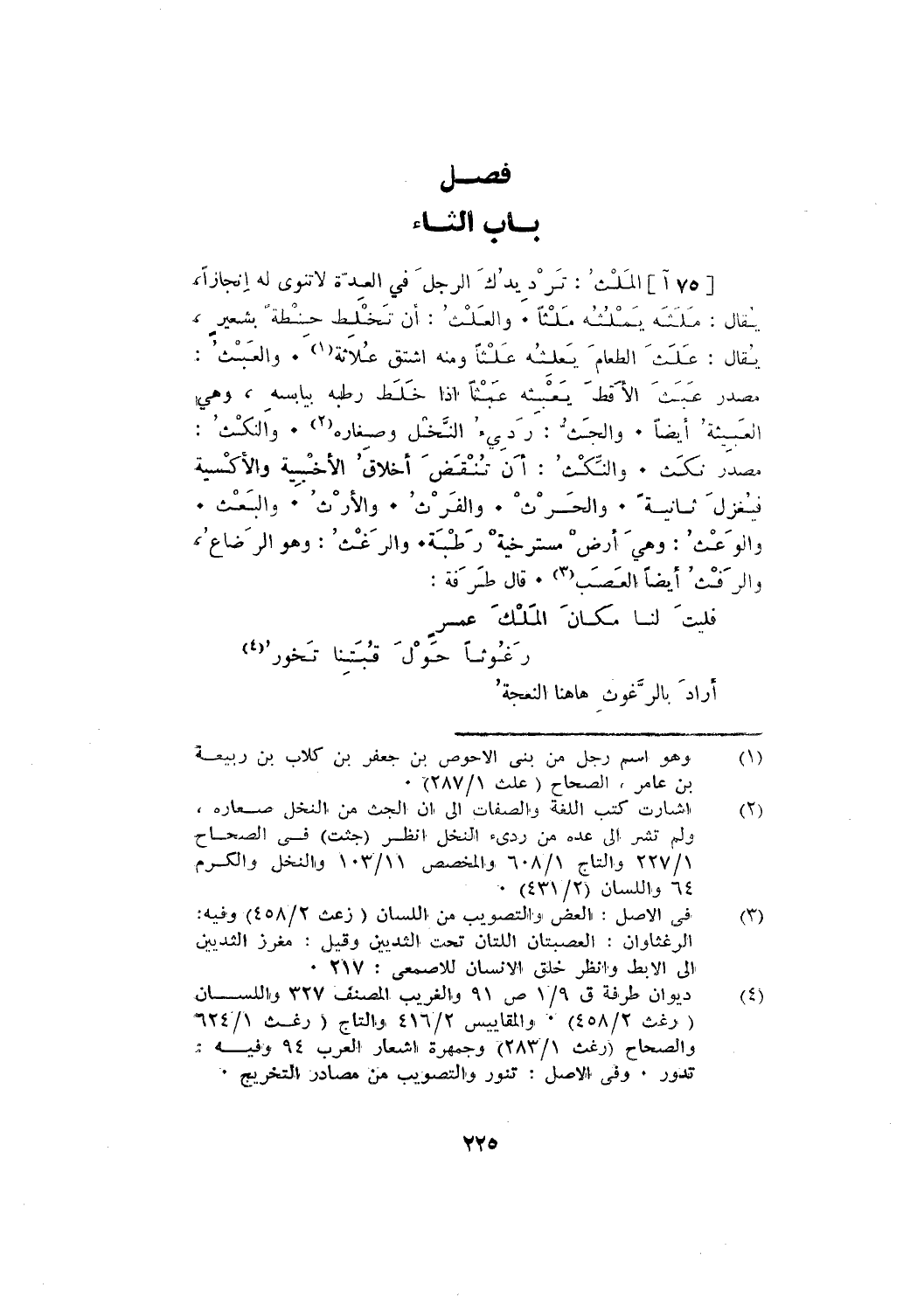 [75 آ] الملث: ترديدك الرجل في العدة لا تنوي له إنجازًا، يقال: ملثه يملثه ملثًا. والعلث: أن تخلط حنطة بشعير، يقال: علث الطعام يعلثه علثًا ومنه اشتق علاثة. والعبث: مصدر عبث الأقط يعبثه عبثًا إذا خلط رطبه بيابسه، وهي العبيثة أيضًا. والجث: ردئ النخل وصغاره. والنكث: مصدر نكث. والنكث: أن تنقض أخلاق الأخبية والأكسية فيغزل ثانية. والحرث. والفرث. والأرث. والبعث.