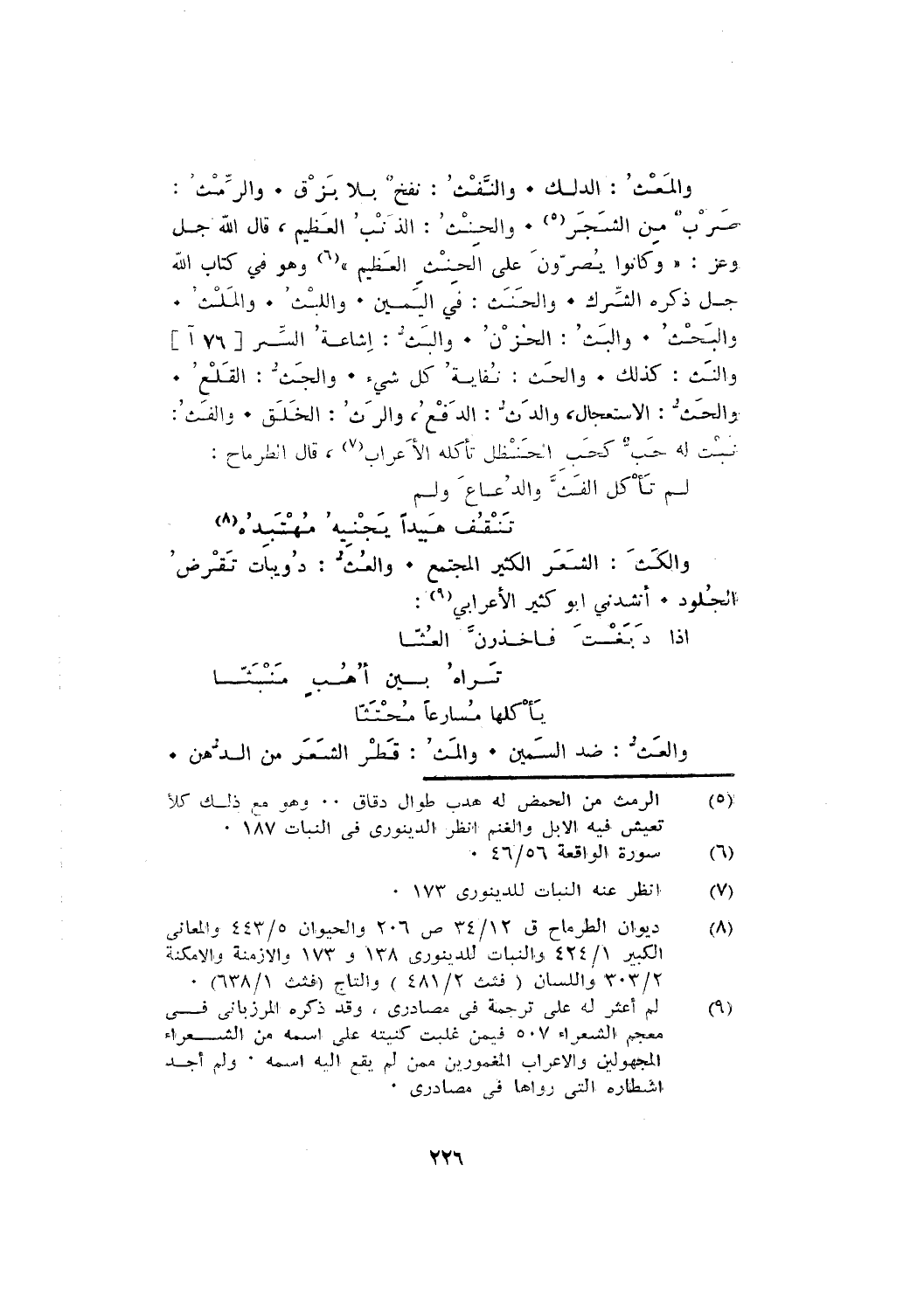 والبحث. والبث: الحزن. والبث: إشاعة السر [76 آ] والنث: كذلك. والحث: نفاية كل شيء. والجث: القلع. والحث: الاستعجال، والدث: الدفع، والرث: الخلق. والفث: نبت له حب كحب الحنظل تأكله الأعراب، قال الطرماح: