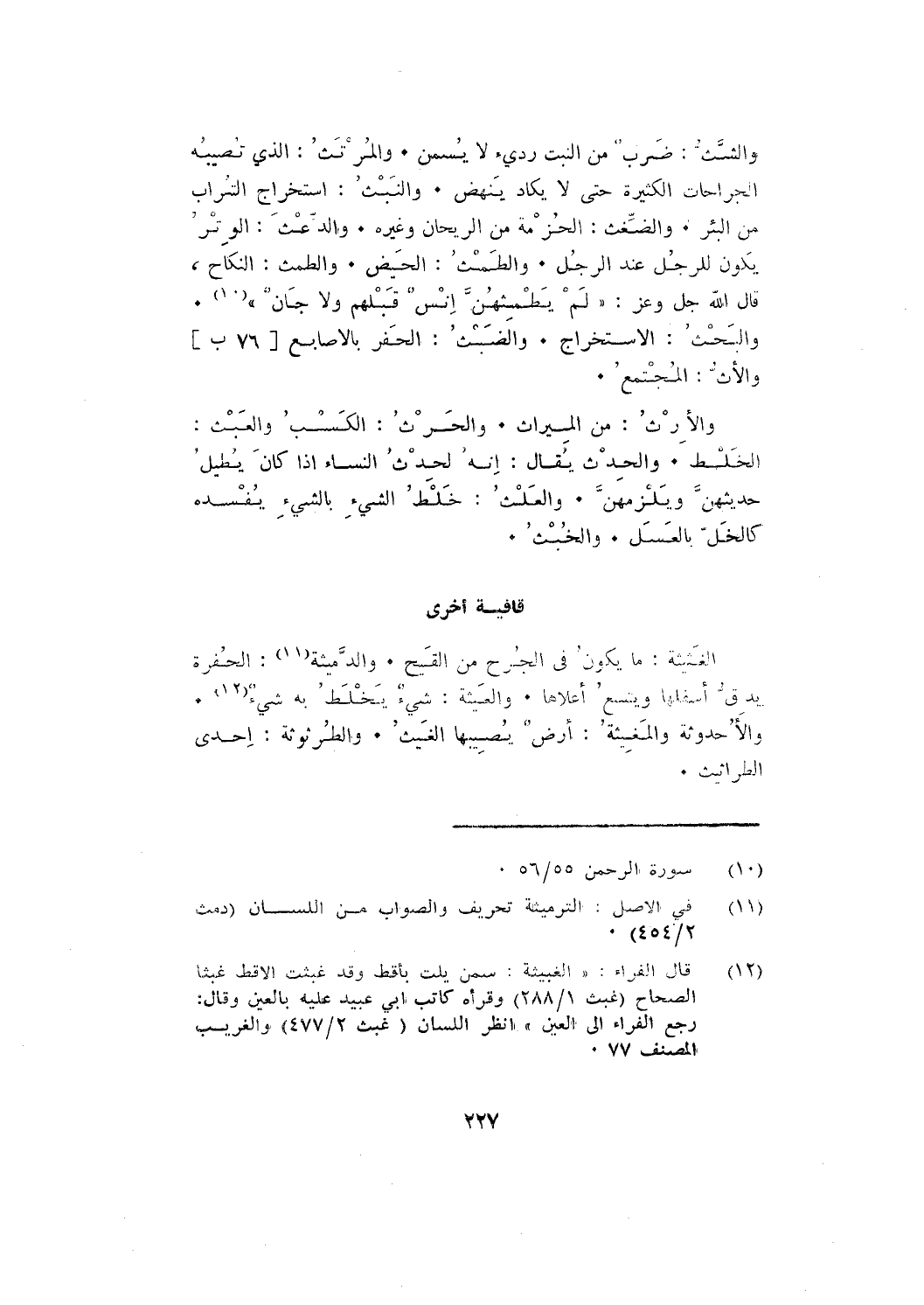والشث: ضرب من النبت رديء لا يسمن. والمرتث: الذي تصيبه الجراحات الكثيرة حتى لايكاد ينهض. والنبث: استخراج التراب من البئر. والضغث: الحزمة من الريحان وغيره. والدعث: الوتر يكون للرجل عند الرجل. والطمث: الحيض. والطمث: النكاح، قال الله جل وعز: {لَمْ يَطْمِثْهُنَّ إِنْسٌ قَبْلَهُمْ وَلَا جَانٌّ}.