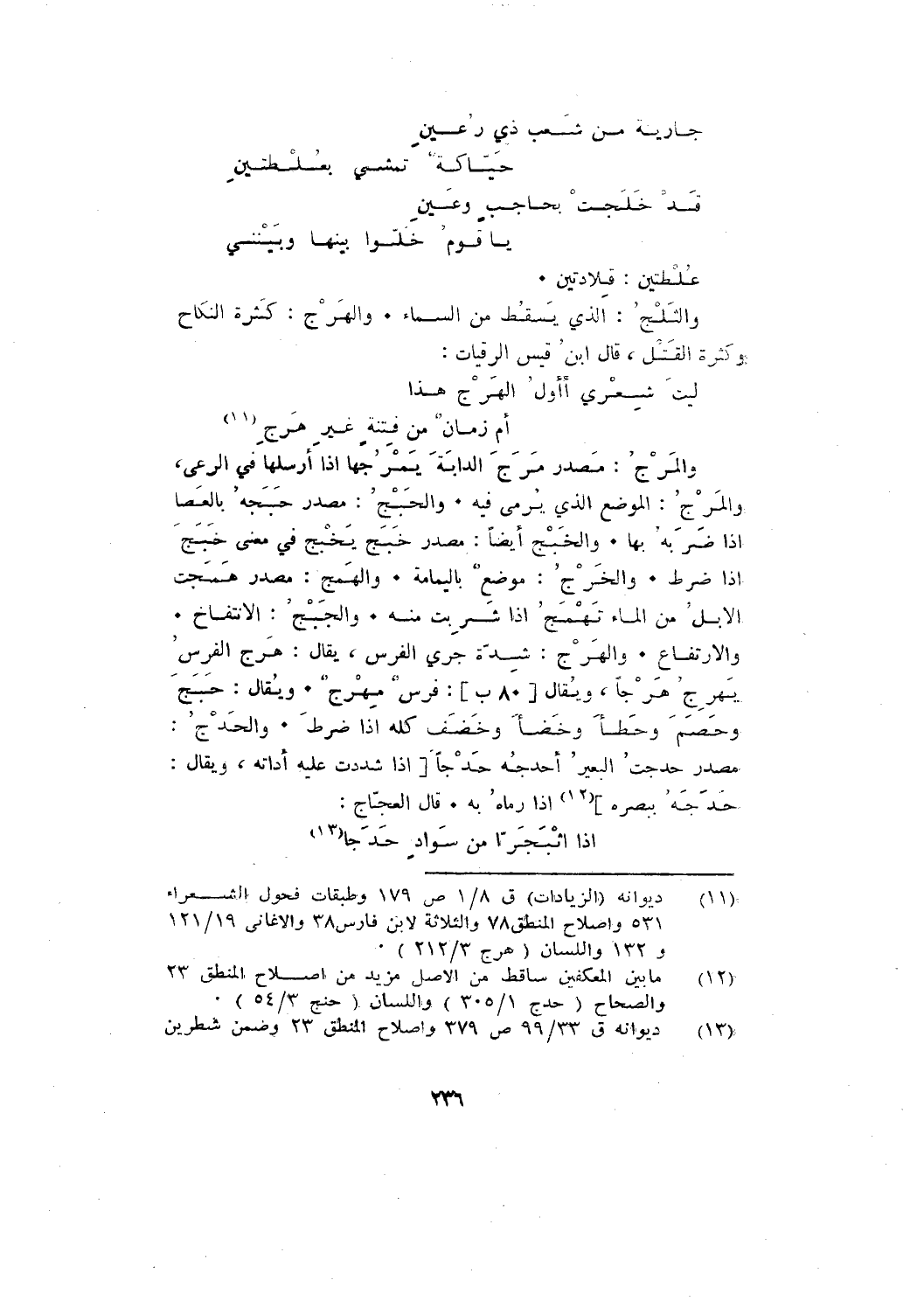 والارتفاع. والهرج: شدة جري الفرس، يقال: هرج الفرس يهرج هرجا، ويقال [80 ب]: فرس مهرج. ويقال: حبج وحصم وحطأ وخضأ وخضف كله إذا ضرط. والحدج: مصدر حدجت البعير أحدجه حدجًا [إذا شددت عليه أداته، ويقال: حدجه ببصره] إذا رماه به. قال العجاج: