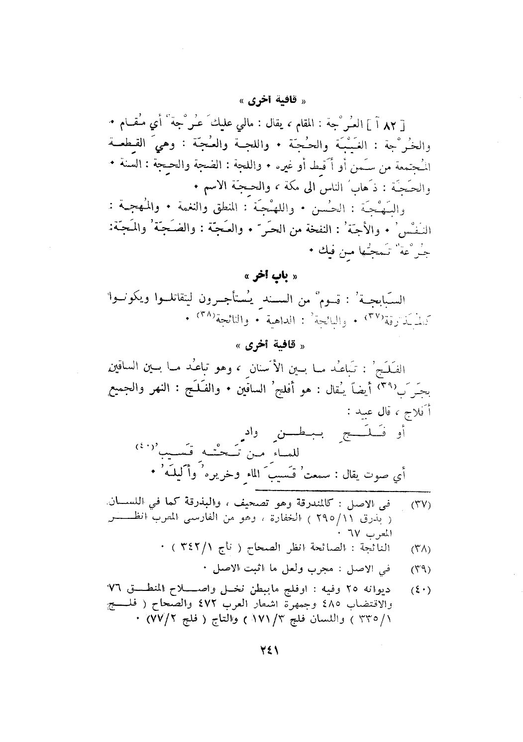 [82 آ] العرجة: المقام، يقال: مالي عليك عرجة؛ أي: مقام. والخرجة: الغيبة والحجة. واللجة والعجة: وهي القطعة المجتمعة من سمن أو أقط أو غيره. واللجة: الضجة والحجة: السنة. والحجة: ذهاب الناس إلى مكة، والحجة الاسم.