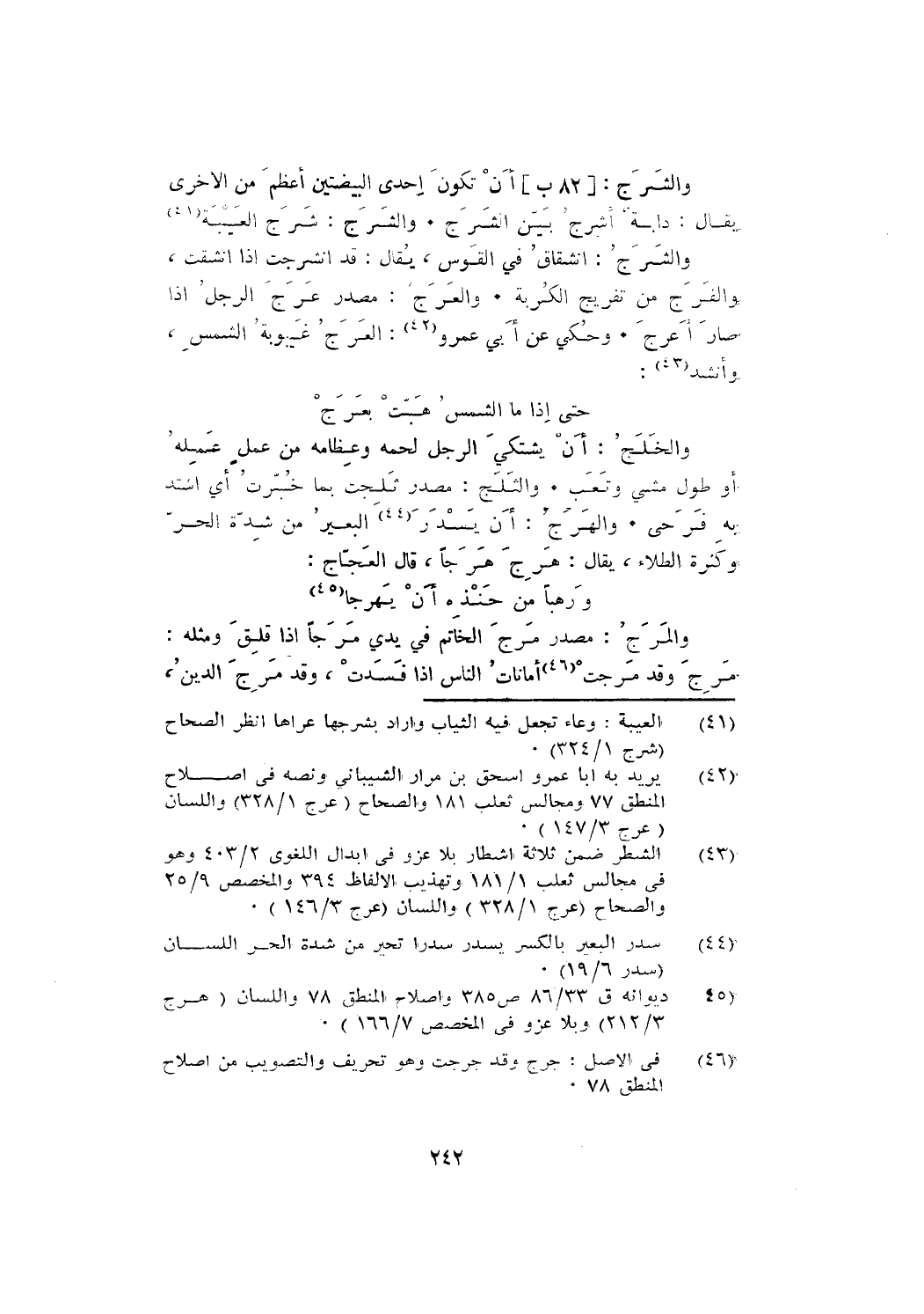 والشرج: انشقاق في القوس، يقال: قد انشرجت إذا انشقت، والفرج من تفريج الكربة. والعرج: مصدر عرج الرجل إذا صار أعرج. وحكي عن أبي عمرو: العرج غيبوبة الشمس، وأنشد: