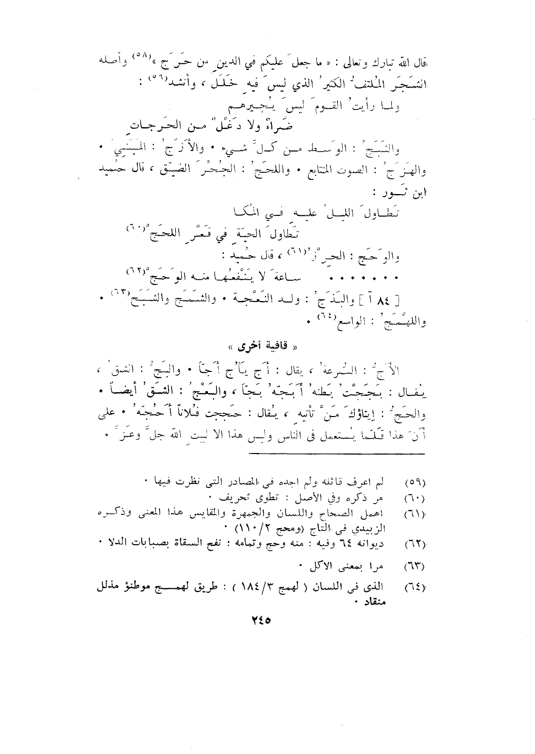 قال الله تبارك وتعالى: {وَمَا جَعَلَ عَلَيْكُمْ فِي الدِّينِ مِنْ حَرَجٍ} وأصله الشجر الملتف الكثير الذي ليس فيه خلل، وأنشد: