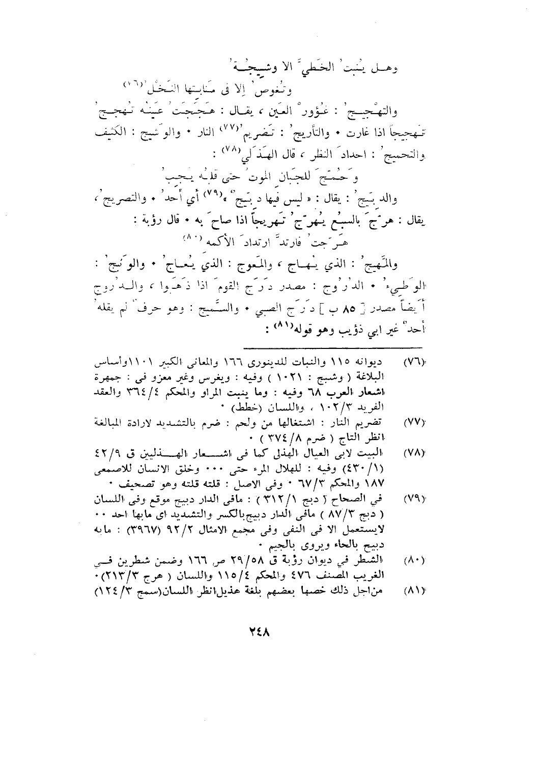 والمهيج: الذي يهاج، والمعوج: الذي يعاج. والونيج [؟ غير واضحة]: الوطئ. الدروج: مصدر درج القوم إذا ذهبوا، والدروج أيضًا مصدر [85 ب] درج الصبي. والسميج: وهو حرف لم يقله أحد غير أبي ذؤيب وهو قوله: