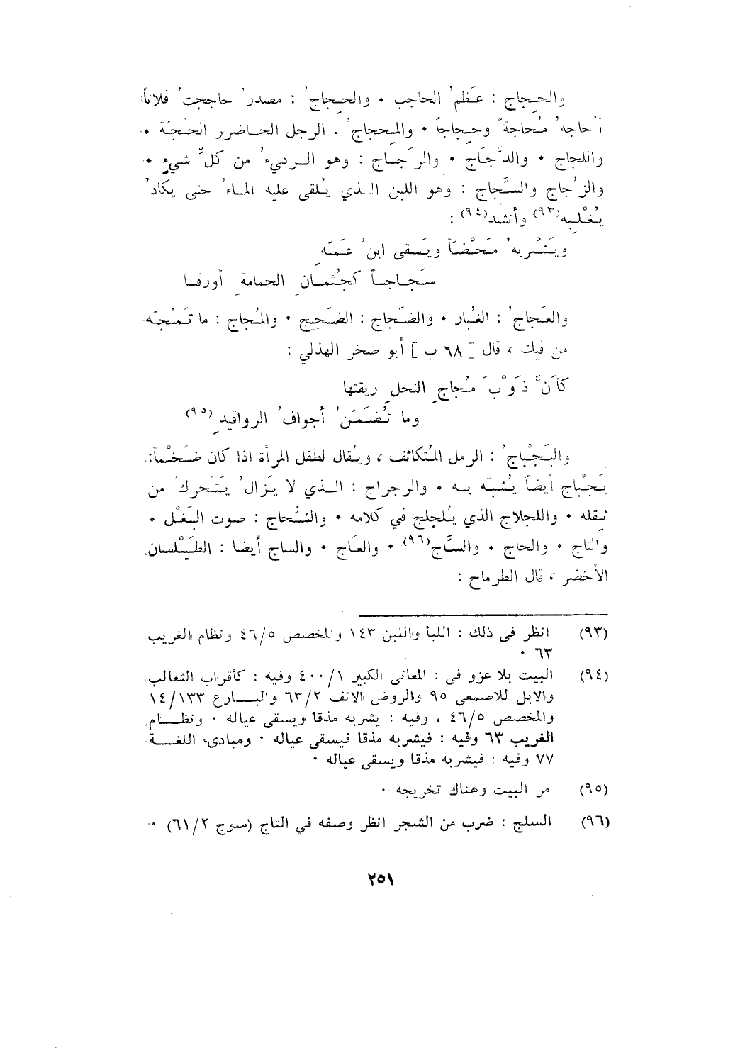 والحجاج: عظم الحاجب. والحجاج: مصدر حاججت فلانًا أحاجه محاجة وحجاجًا. والمحجاج. الرجل الحاضر الحجة. واللجاج. والدجاج. والرجاج: وهو الرديء من كل شيء. والزجاج والسجاج: وهو اللبن الذي يلقى عليه الماء حتى يكاد يغلبه، وأنشد: