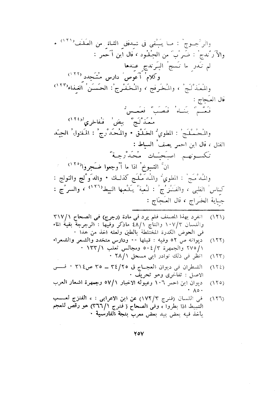 والمدمج: المطوي والمدملج كذلك. والدولج والتولج: كناس الظبي، والفنزج: لعبة يلعبها النبيط، والسرج: جباية الخراج، قال العجاج: