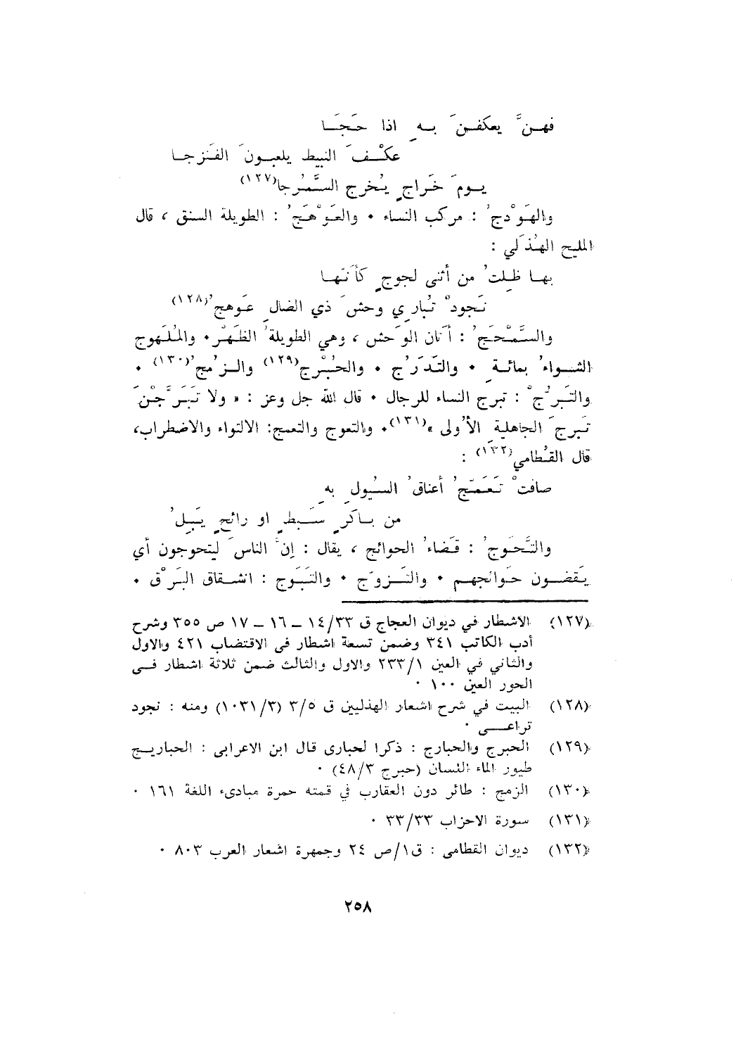 والسمحج: أنان الوحش، وهي الطويلة الظهر. والملهوج الشواء بمائة. والتدرج. والحبرج والزمج. والتبرج: تبرج النساء للرجال. قال الله جل وعز: {وَلَا تَبَرَّجْنَ تَبَرُّجَ الْجَاهِلِيَّةِ الْأُولَى}. والتعوج والتعمج: الالتواء والاضطراب، قال القطامي: