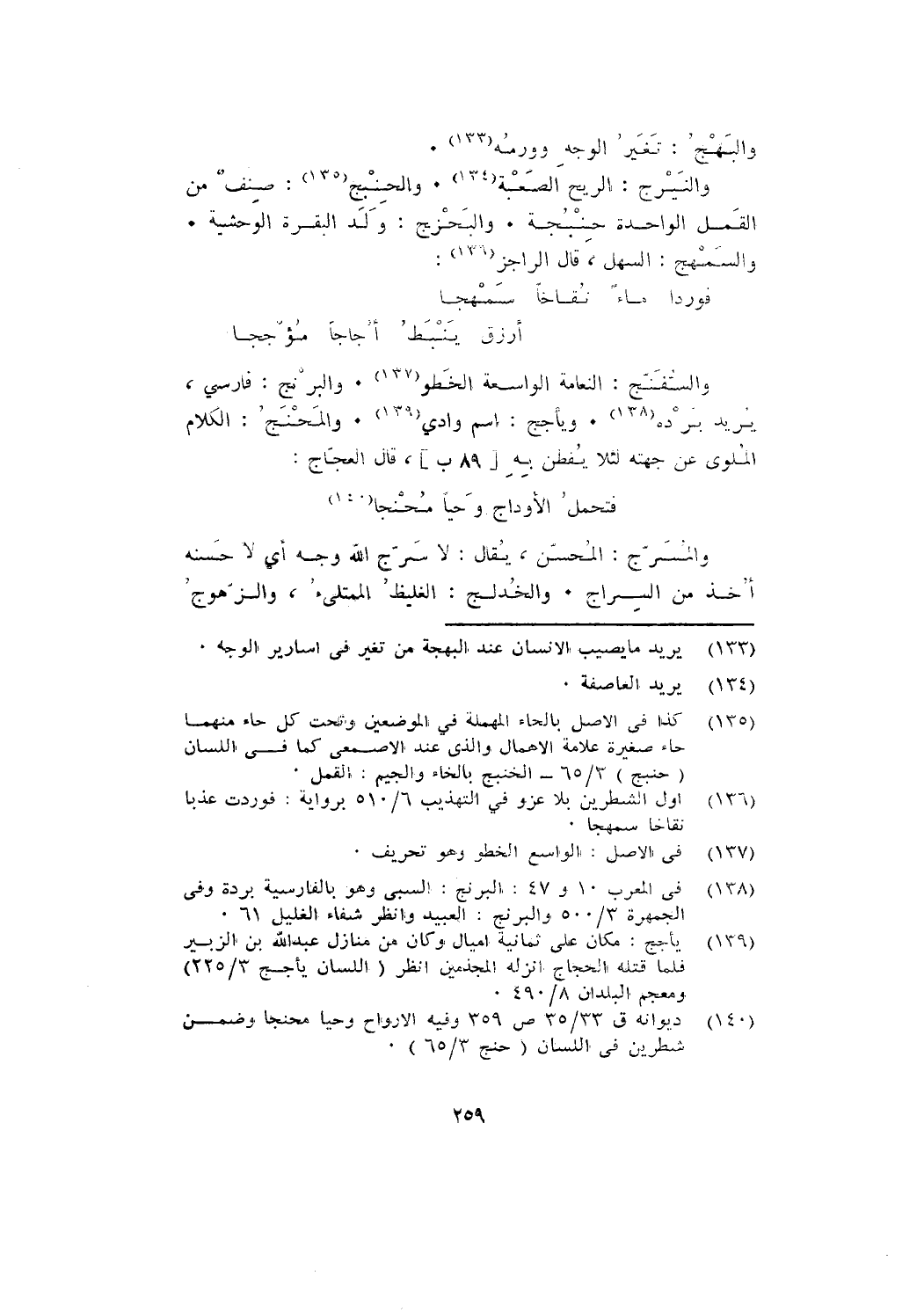والسفنج: النعامة الواسعة الخطو. والبرنج: فارسي، يريد برده. ويأجج: اسم وادي. والمحنج: الكلام الملوى عن جهته لئلا يفطن به [89 ب]، قال العجاج: