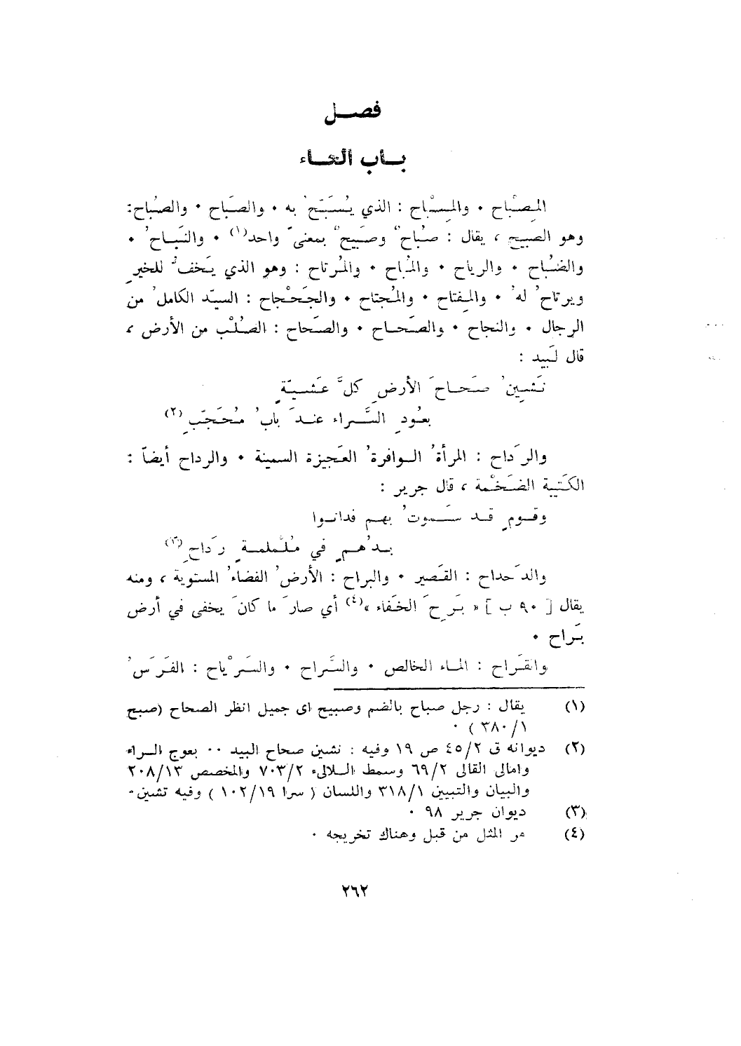 المصباح. والمسباح: الذي يسبح به. والصباح. والصباح: وهو الصبيح، يقال صباح وصبيح بمعنى واحد. والنباح والضباح. والرياح. والمباح. والمرتاح: وهو الذي يخفف للخير ويرتاح له. والمفتاح. والمجتاح. والجحجاح: السيد الكامل من الرجال. والنجاح. والصحاح. والصحاح: الصلب من الأرض، قال لبيد: