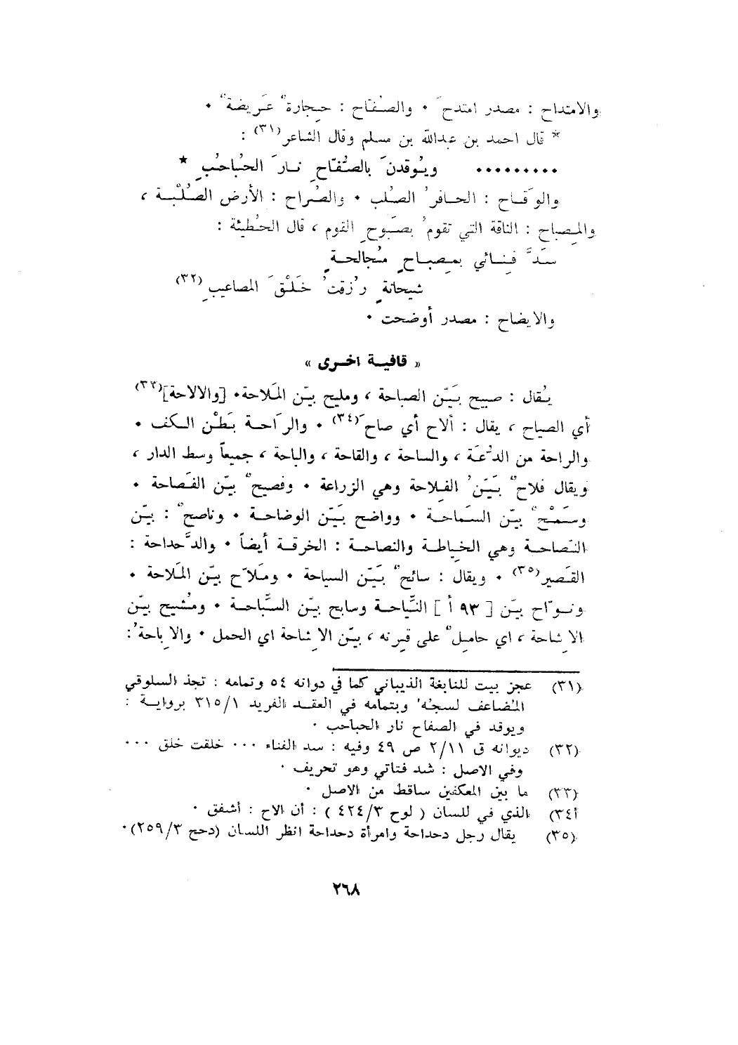 والراحة من الدعة، والساحة، والقاحة، والباحة، جميعًا وسط الدار، ويقال: فلاح بيِّن الفلاحة وهي الزراعة. وفصيح بيِّن الفصاحة.