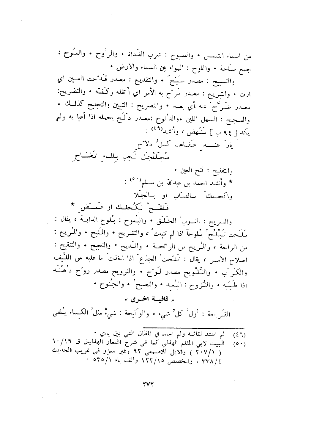 والسريح: الثوب الخلق. والبلوح: بلوح الدابة، يقال: بلحت تبلح بُلوحًا إذا لم تنبعث، والتشريح. والمنيح. والمريح: من الراحة، والمريح من الرائحة. والمديح. والنجيح. والتنقيح: إصلاح الأمر، يقال: نقحت الجذع إذا أخذت ما عليه من الليف والكرب. والتلويح مصدر لوح. والترويح مصدر روح دهنه إذا طيبه. والنزوح: البعد. والنصيح. والجنوح.